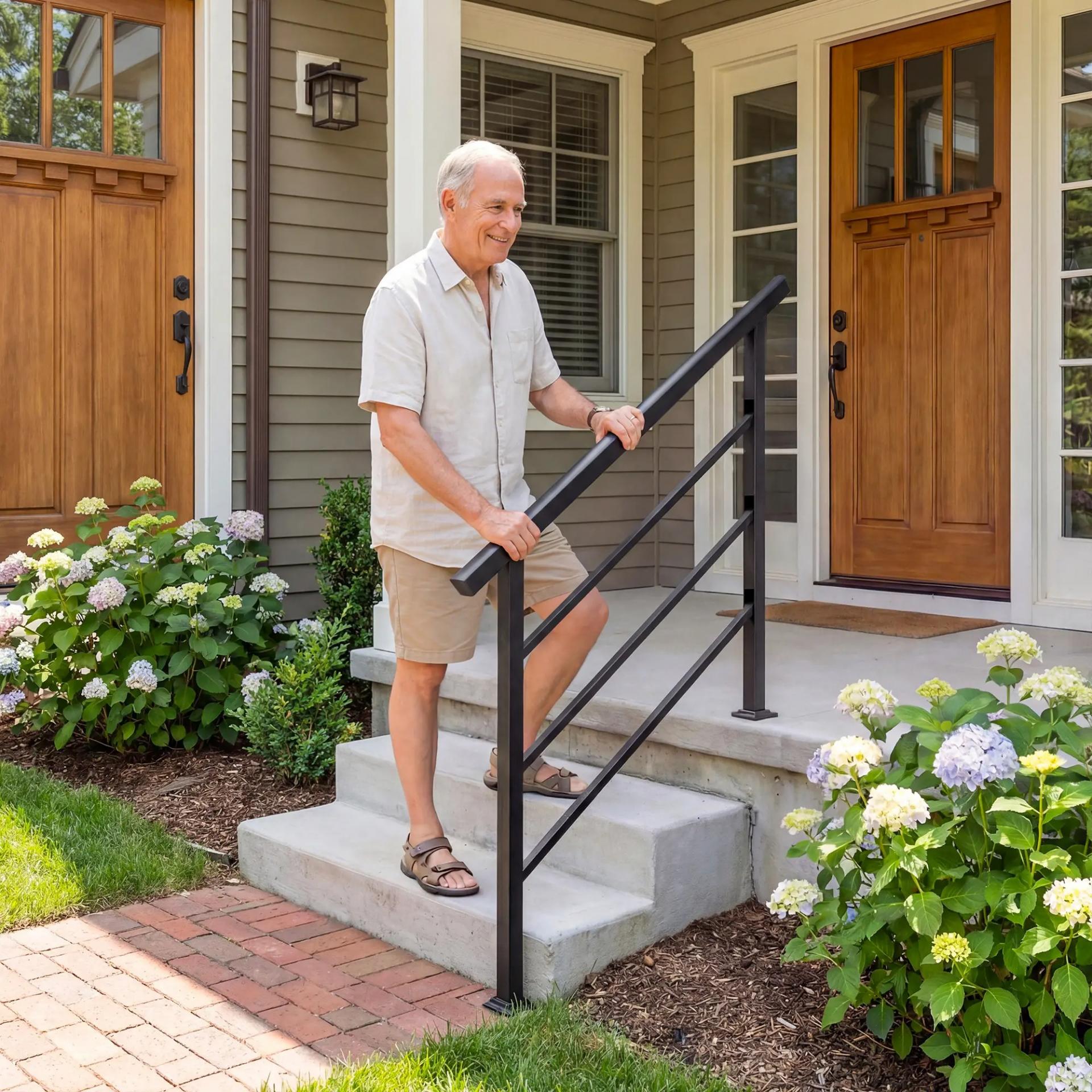 - - DISEÑO SIMPLE Y ELEGANTE: De metal negro con tres barras horizontales, esta barandilla de escalera exterior combina con escaleras, parques u hoteles, aportando elegancia y soporte seguro