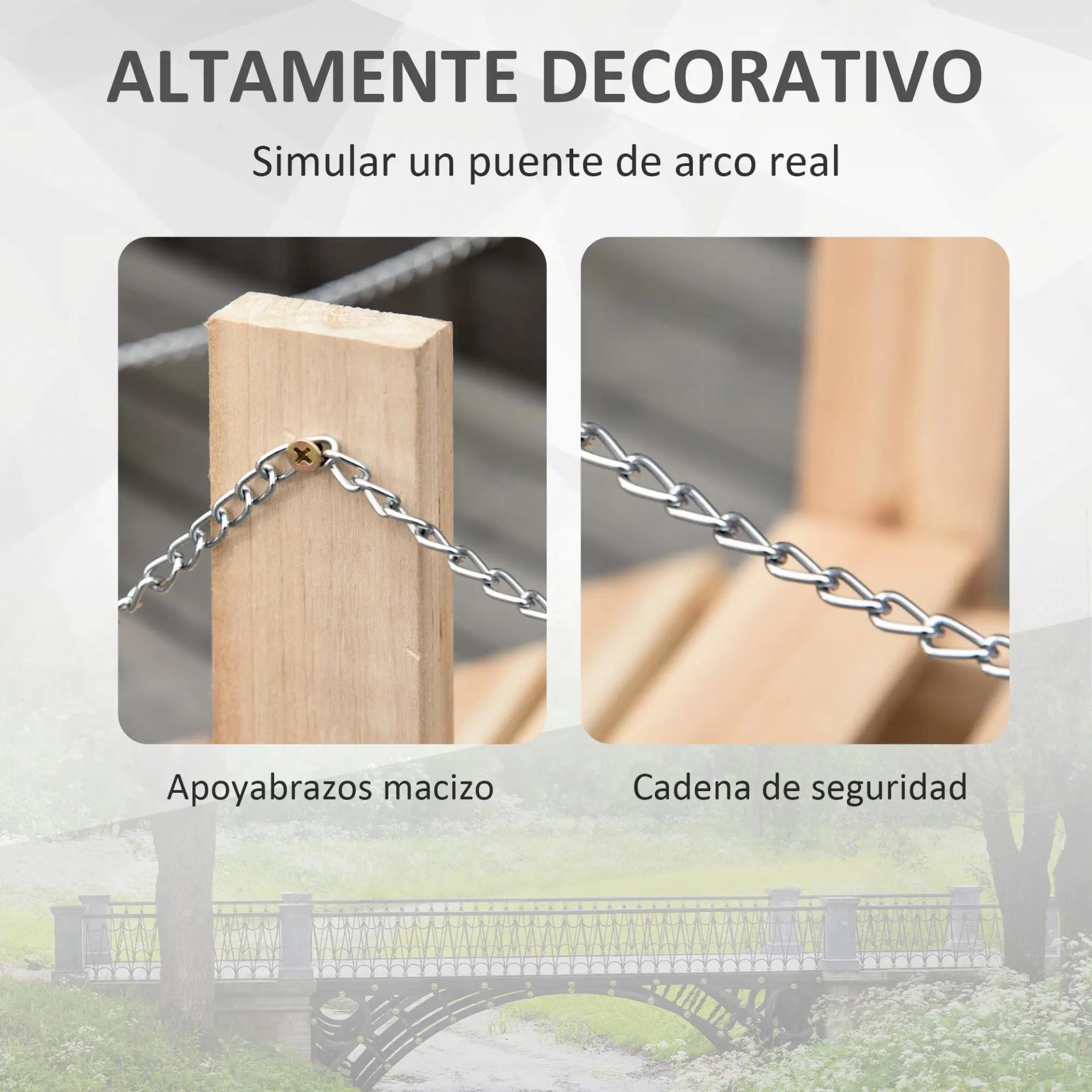 - - PUENTE CON ARCO: Su estructura decorativa con arco aporta un estilo atemporal y refinado. Fabricado en madera de abeto con acabado natural, este puente de jardín ofrece calidez y un diseño sofisticado, complementado con cadenas metálicas en los laterales para mayor realce