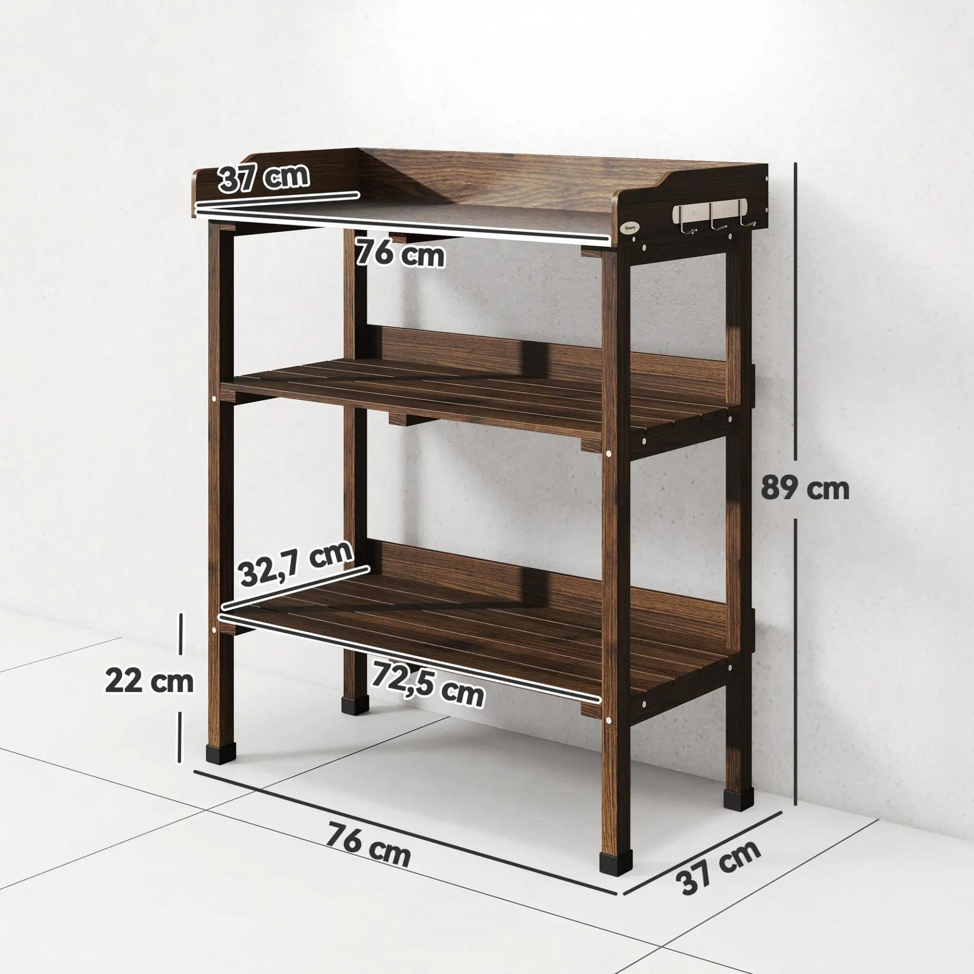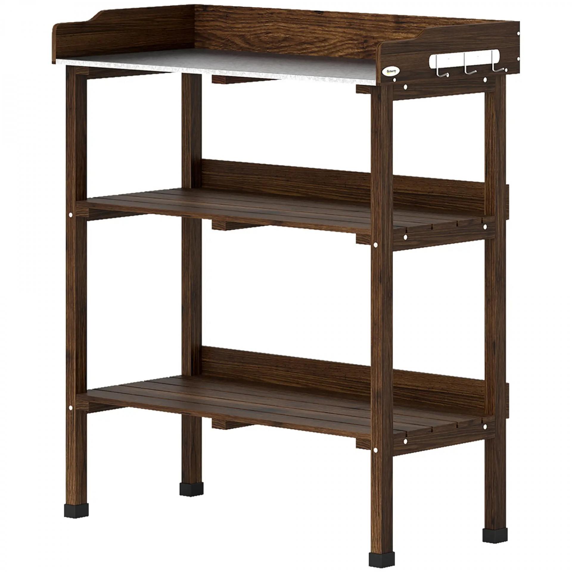 Mesa de Jardinería de Madera con Superficie Metálica Estantes y Ganchos para Jardín Terraza 76x37x89 cm Carbonizado