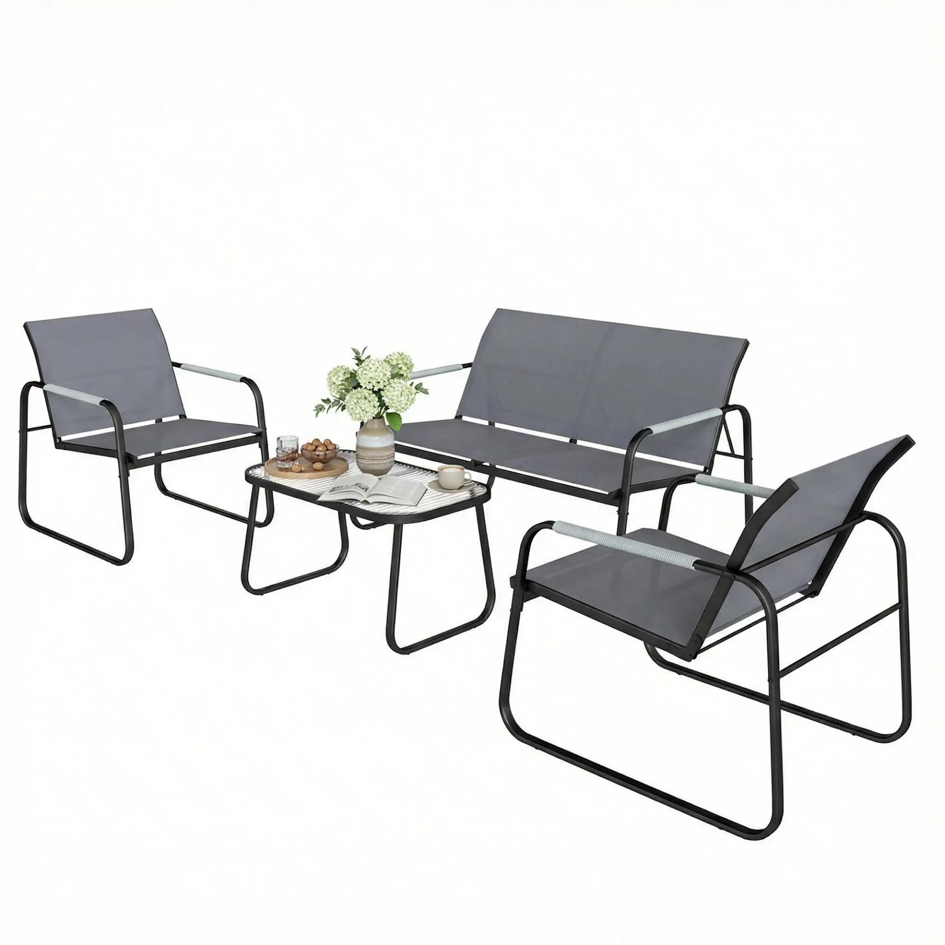 Conjunto de Jardín Exterior con 1 Sofá de 2 Plazas 2 Sillones y Mesa de Vidrio Templado Textilene Transpirable Gris