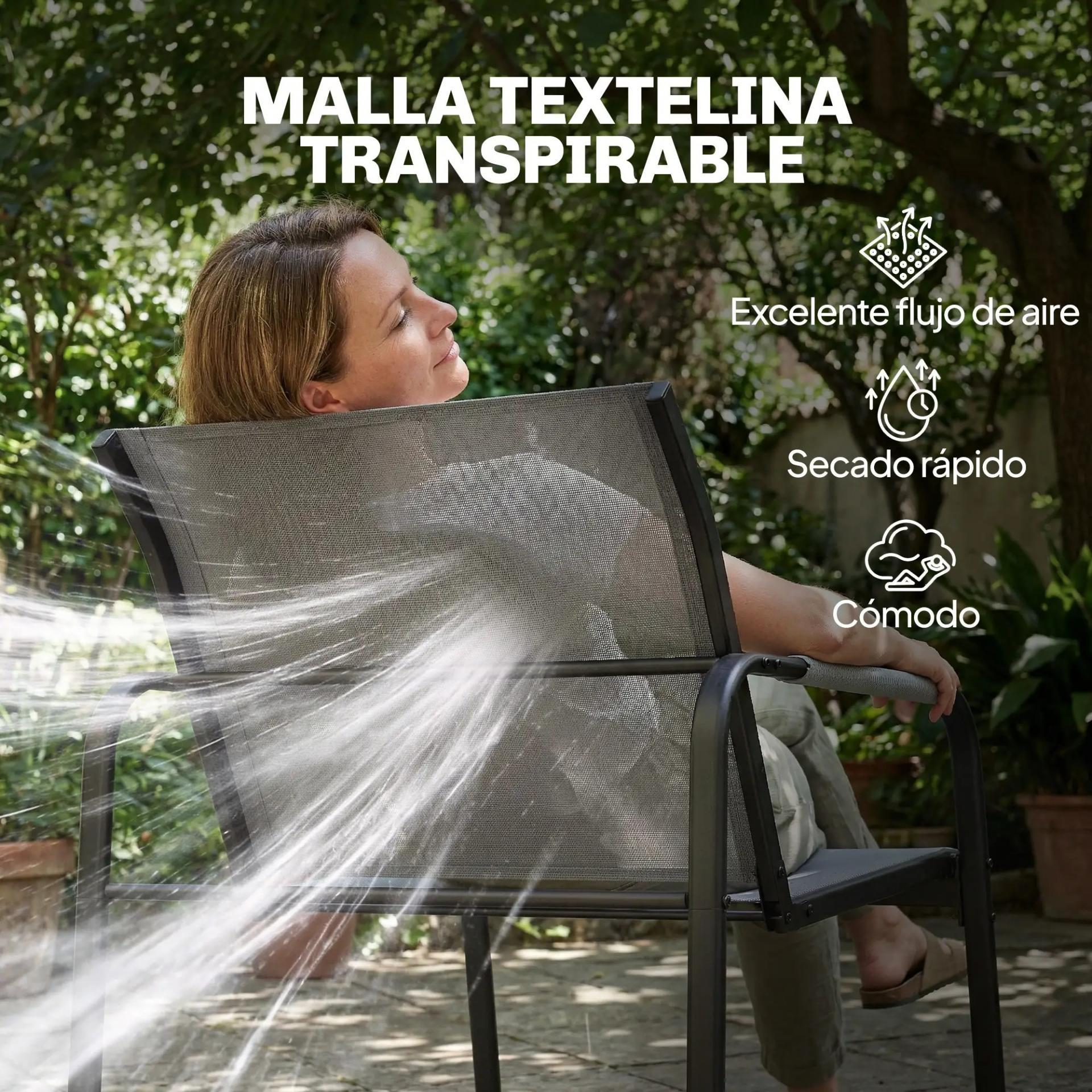 - - MALLA TEXTELINE TRANSPIRABLE: Los asientos y respaldos de este conjunto de jardín están fabricados con malla Texteline de alta calidad, que garantiza una excelente ventilación y secado rápido, proporcionando frescura y comodidad durante su uso
