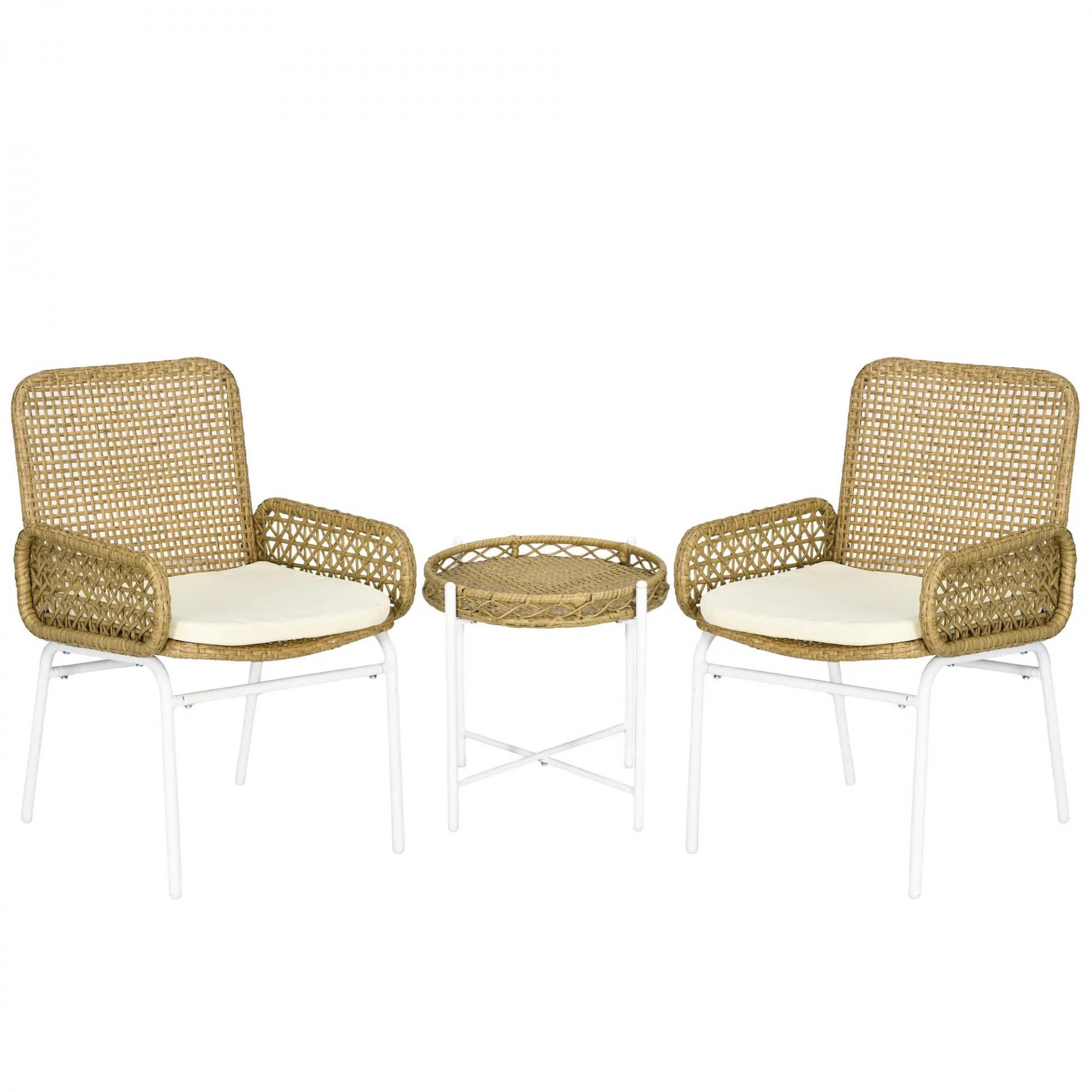 - CONJUNTO DE JARDÍN: Este conjunto de muebles de jardín para terrazas pequeñas de ratán sintético de 3 piezas, incluye dos sillas con cojines y una elegante mesa, ideal para relajarte en tu jardín, balcón o área de patio tomando un café o un refresco en compañía