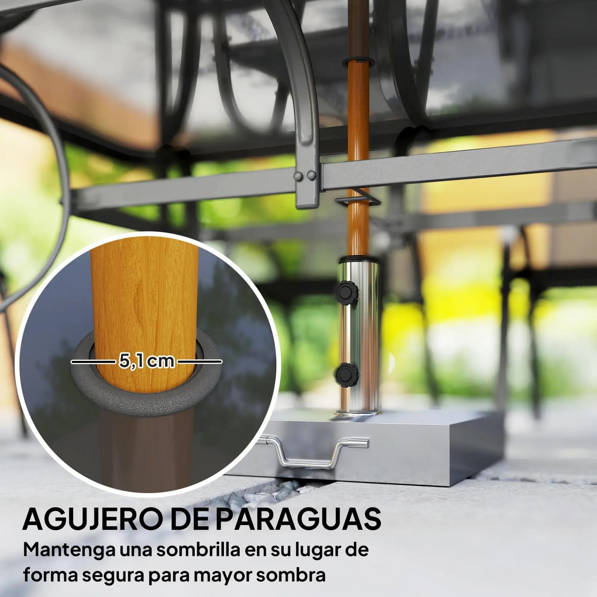 - - MESA CON ENCIMERA DE CRISTAL Y ORIFICIO PARA SOMBRILLA: La mesa de este conjunto de mesa y sillas para terraza cuenta con una encimera de cristal templado, proporcionando una superficie resistente y segura para comer. Además, la mesa tiene un orificio de 51 mm de diámetro para colocar una sombrilla