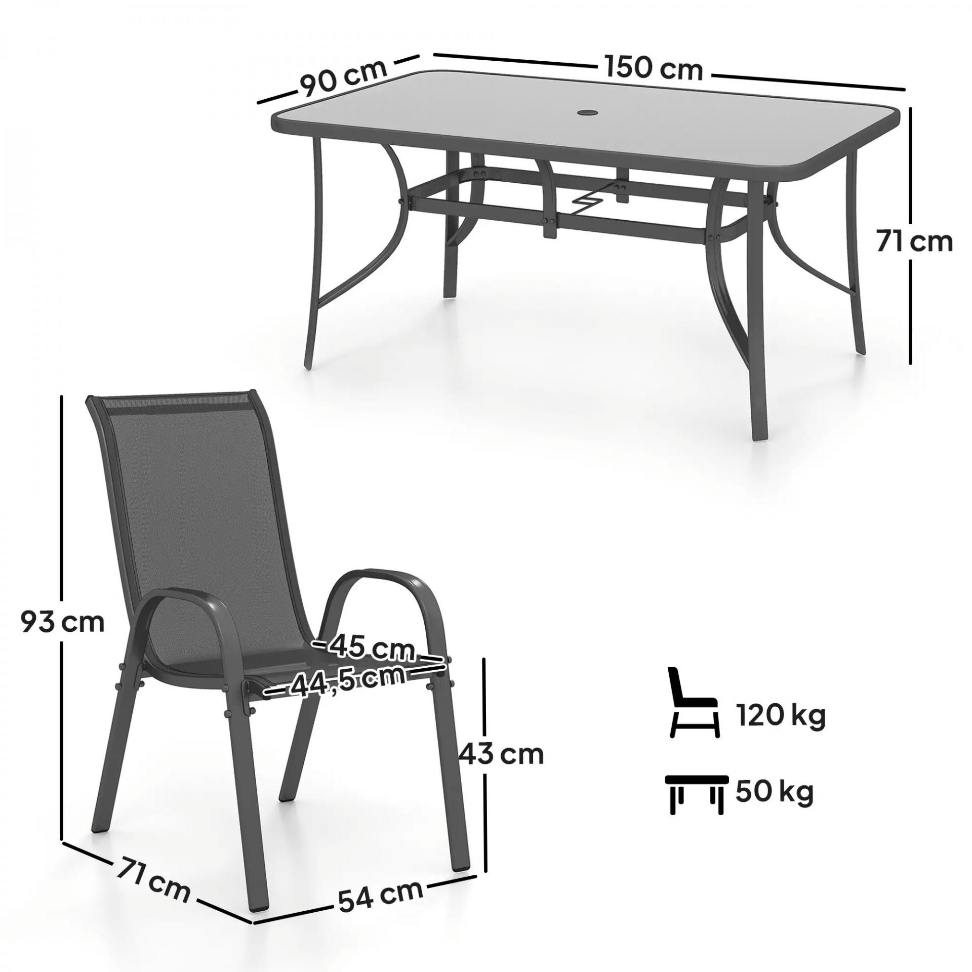 - - MEDIDAS TOTALES: La mesa mide 150x90x71 cm (LxANxAL) y cada una de las sillas 54x71x93 cm (LxANxAL). Peso máximo soportado: 50 kg (mesa) y 120 kg (cada silla)