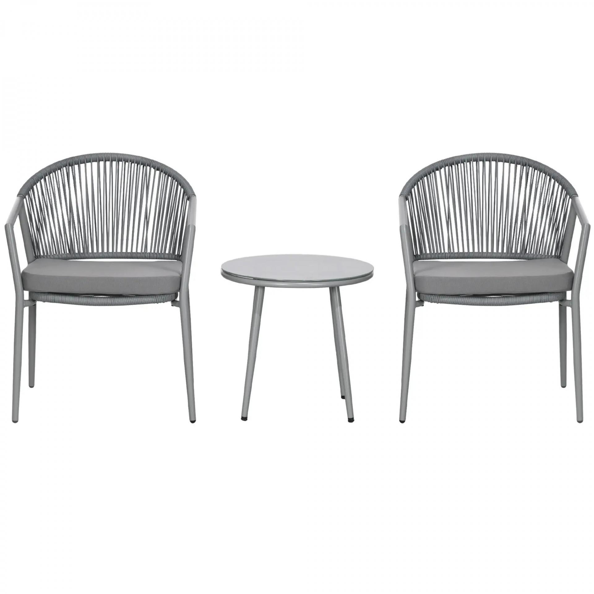 Juego de 2 Sillas y Mesa de Ratán con Cojines Acolchados y Encimera de Vidrio para Balcón Terraza Gris