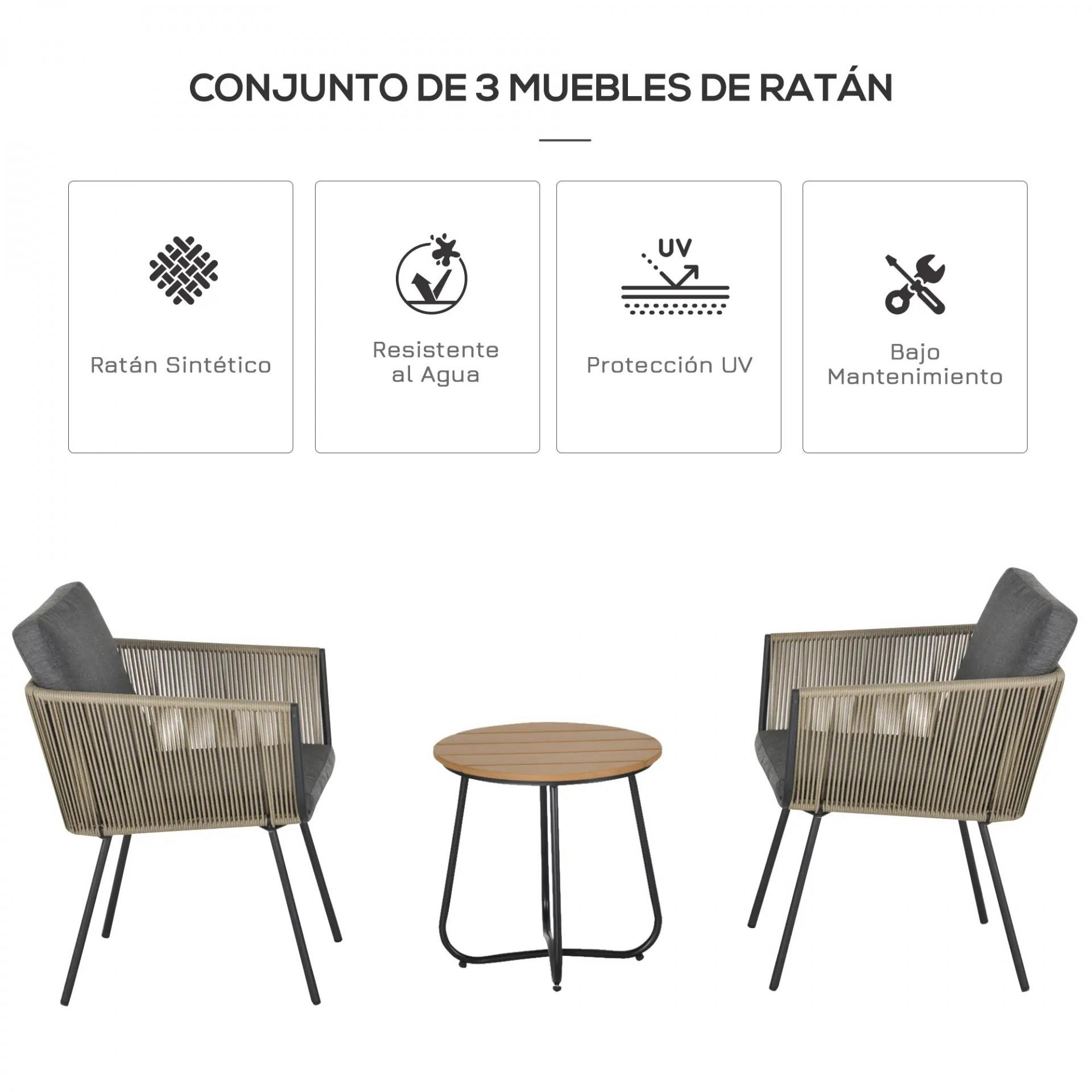 - CONJUNTO DE 3 MUEBLES DE EXTERIOR: Conjunto de muebles de jardín compuesto por 2 sillas con estructura de metal y ratán sintético y una mesa con encimera plástica imitación madera. Ideal para que tomes un descanso solo o te relajes con tus amigos bajo el sol