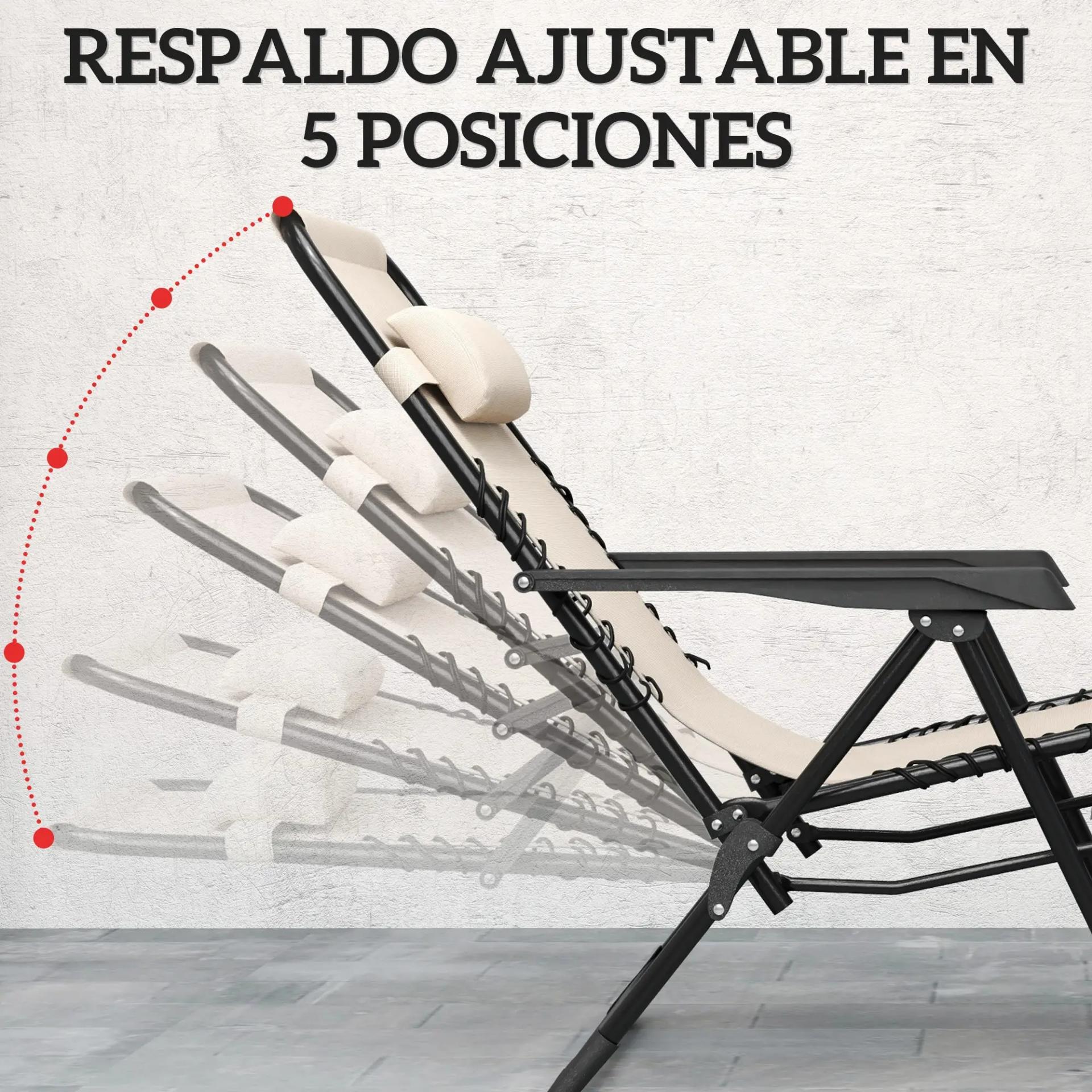 - SILLA RECLINABLE DE GRAVEDAD CERO: El respaldo ajustable en 5 posiciones de las tumbonas te permite encontrar el ángulo ideal para relajarte. Incluye un reposacabezas desmontable para mayor comodidad y soporte, ofreciéndote una experiencia de descanso óptima