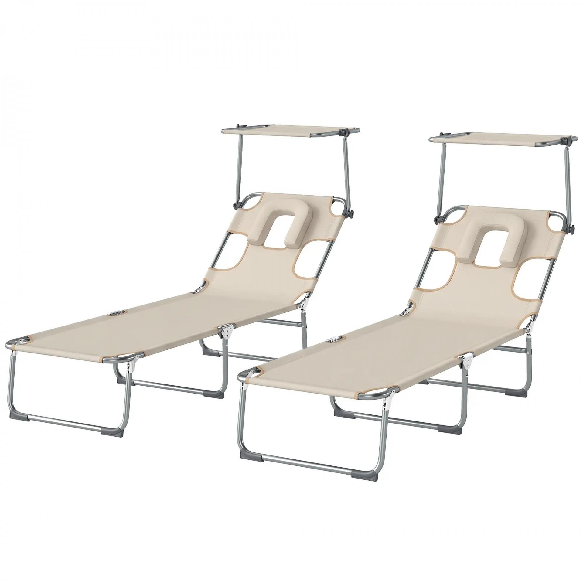 Set de 2 Tumbonas Plegables Reclinables con Dosel 360° Orificio Facial Bolsillo Lateral y Textilene 550 g/m² Beige