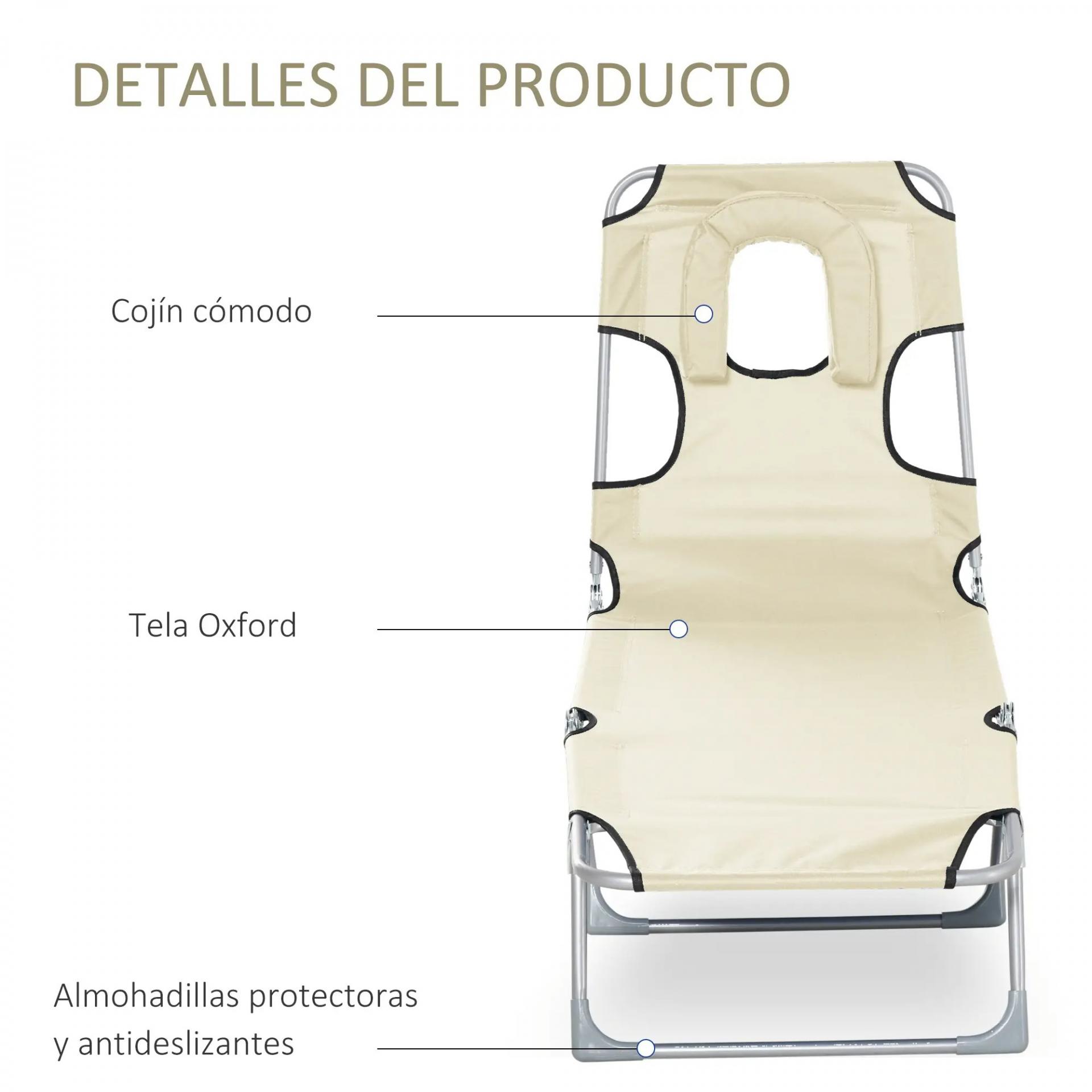 Tumbona Reclinable y Plegable de Jardín con Orificio de Lectura Reposacabezas y Respaldo Ajustable en 5 Niveles para Playa 182x56x28 cm Beige