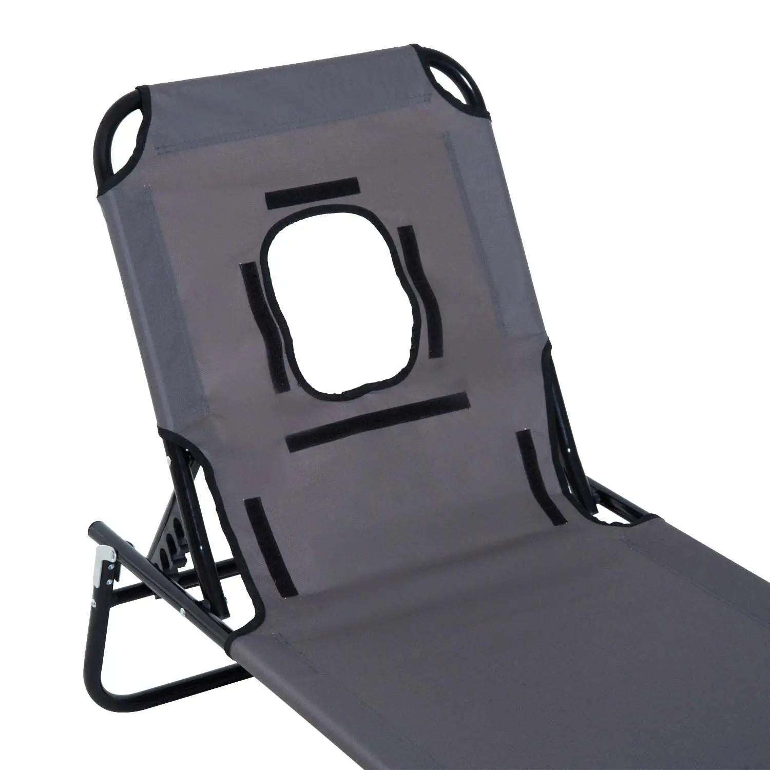 - - RESPALDO RECLINABLE: El respaldo de esta tumbona reclinable plegable se puede ajustar hasta en 4 posiciones diferentes para que puedas adaptar su altura a tus necesidades. Además de los cojines alrededor del orificio para la cabeza cuenta con otro lumbar para apoyar la espalda y/o pecho