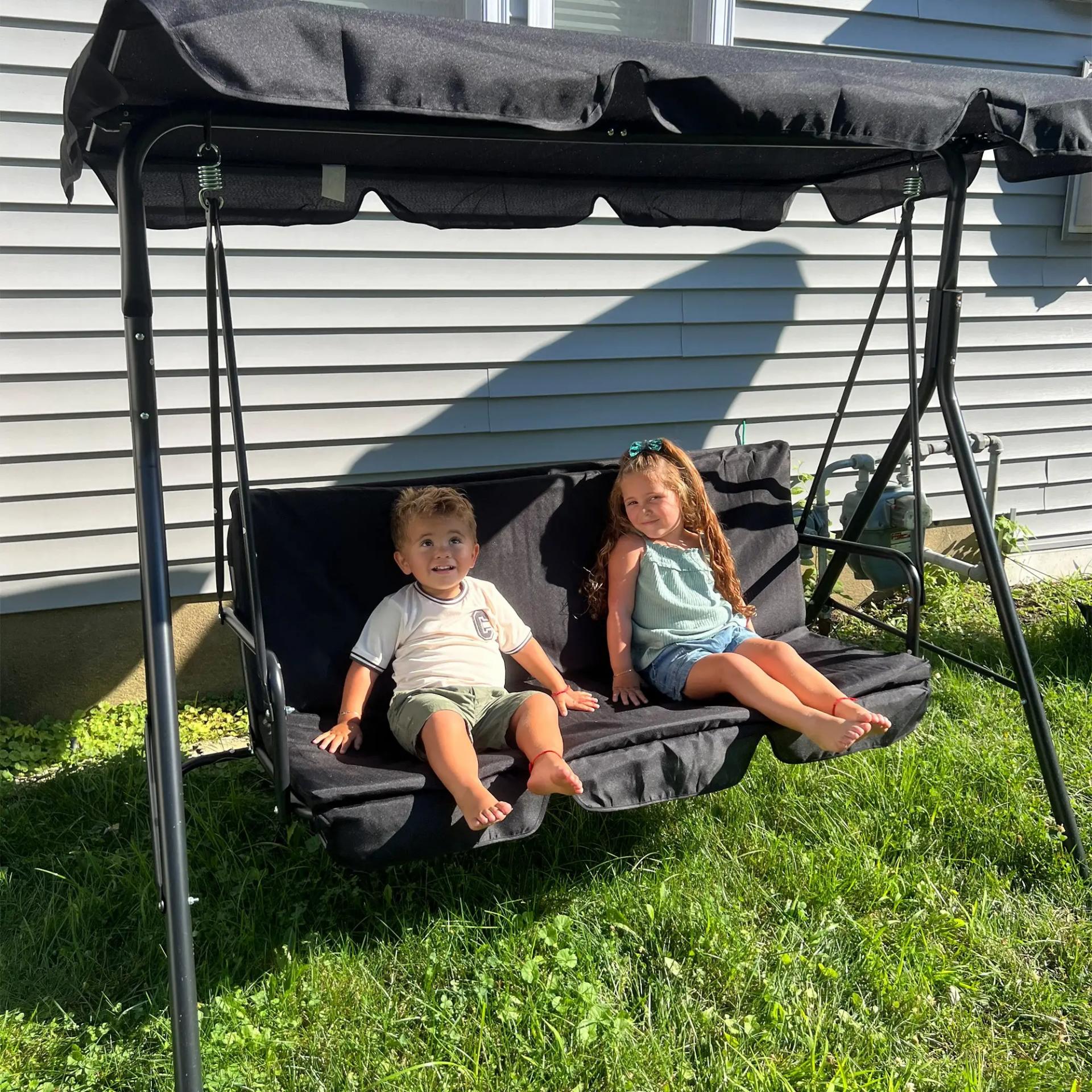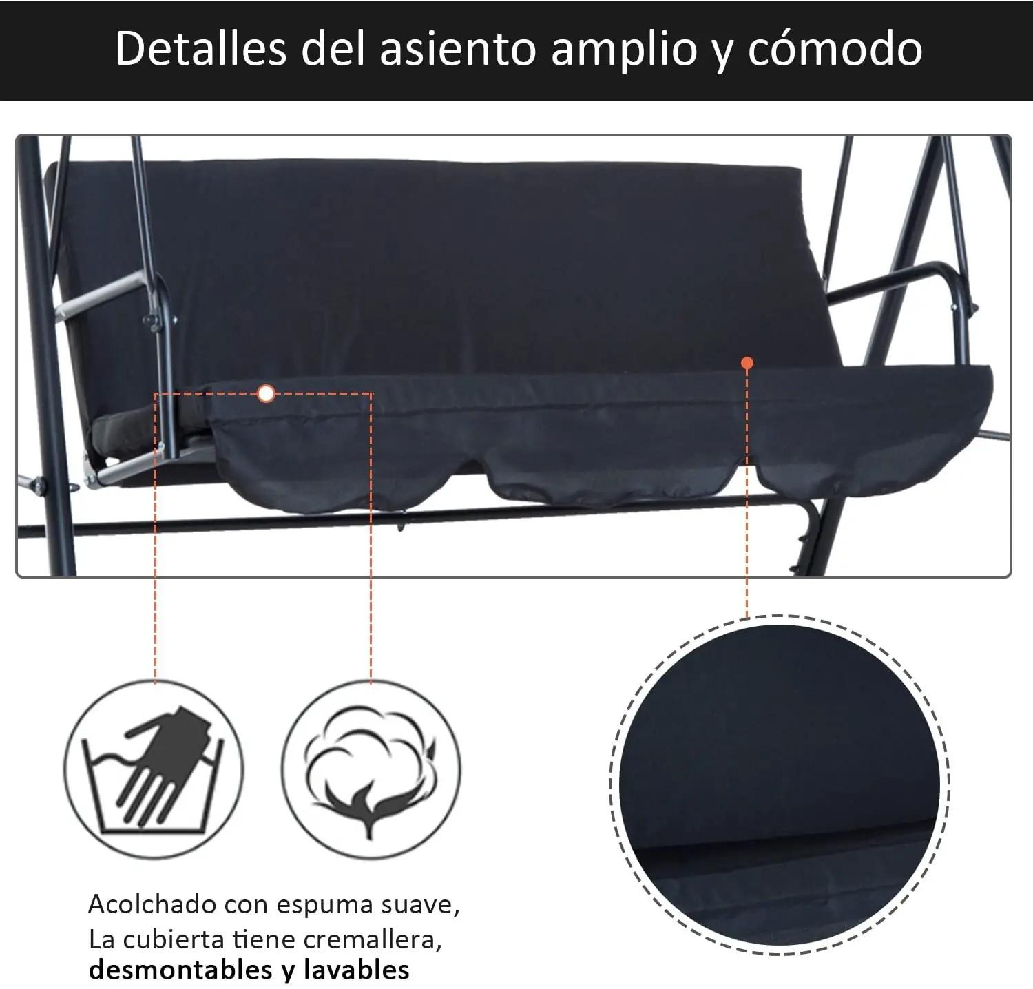 - - MÁXIMA COMODIDAD: Este balancín de jardín con toldo cuenta con un asiento y respaldo de lo más cómodos gracias al cojín de dos secciones que los cubre por completo, ofreciendo así un asiento espacioso y de lo más confortable para 3 personas