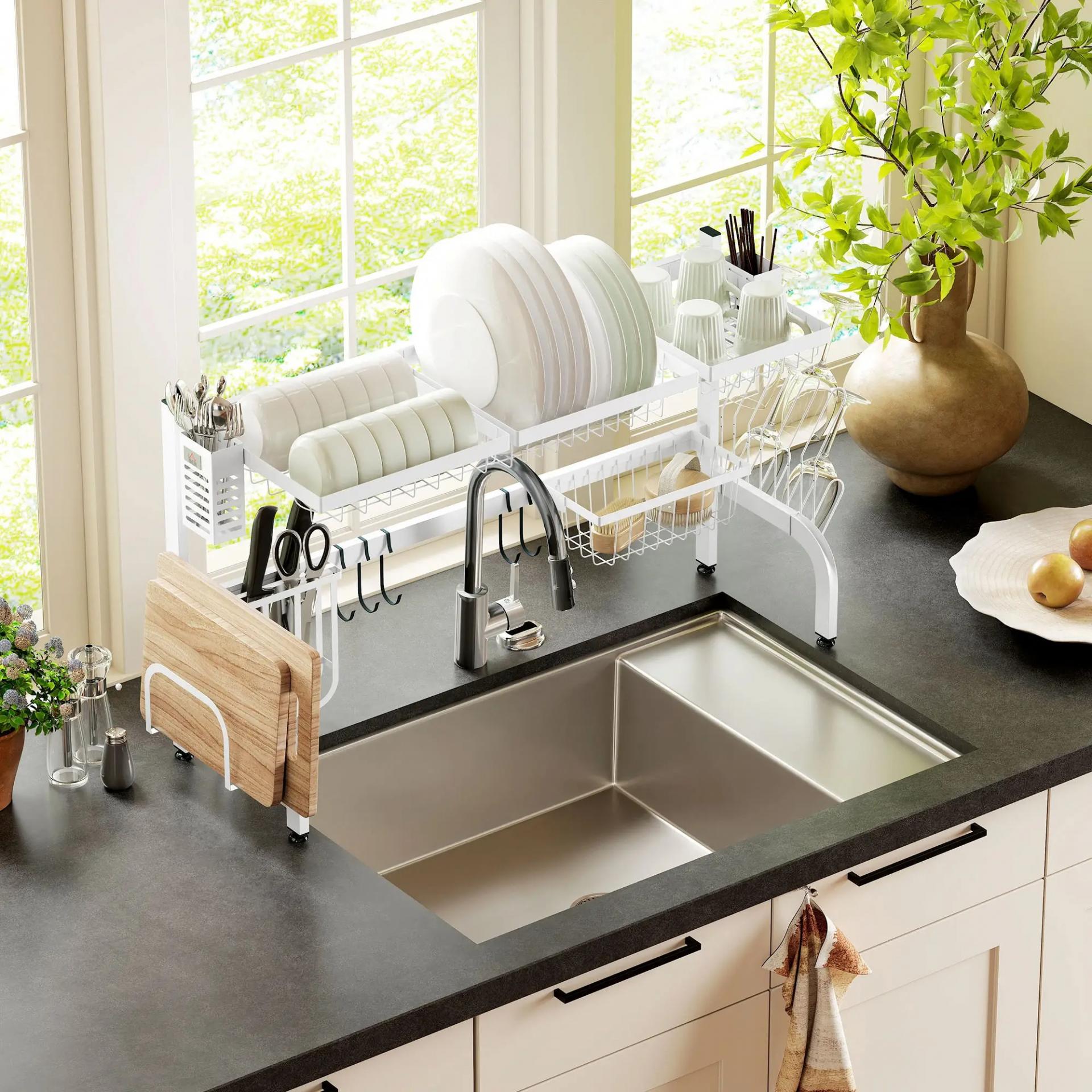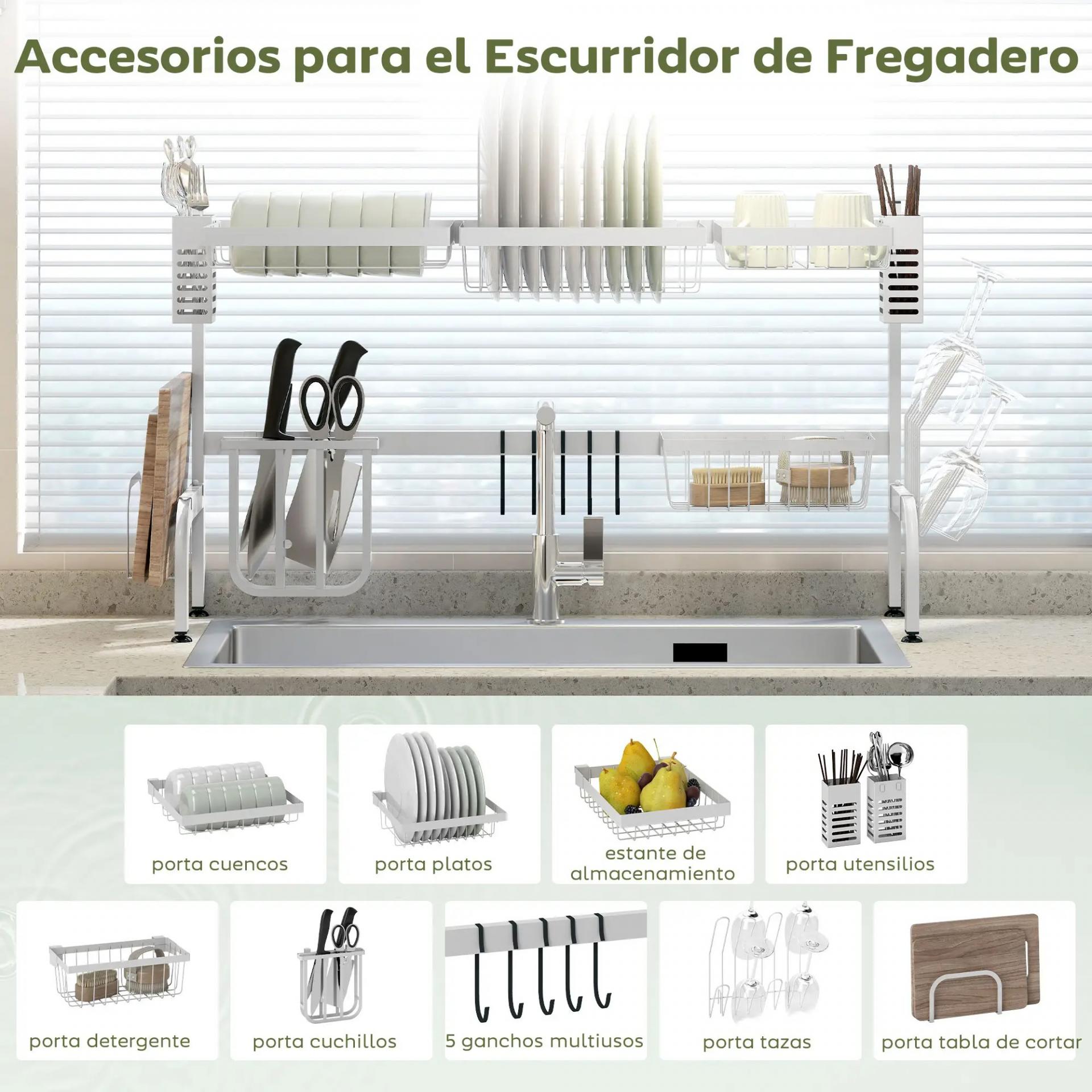 - - MULTIFUNCIONAL: No solo es un escurridor de platos para fregadero, sino que también dispone de espacio para escurrir tazones, cubiertos, cuchillos, vasos y tiene un soporte para la tabla de cortar y 5 ganchos. Ideal para una familia de 4 o más personas