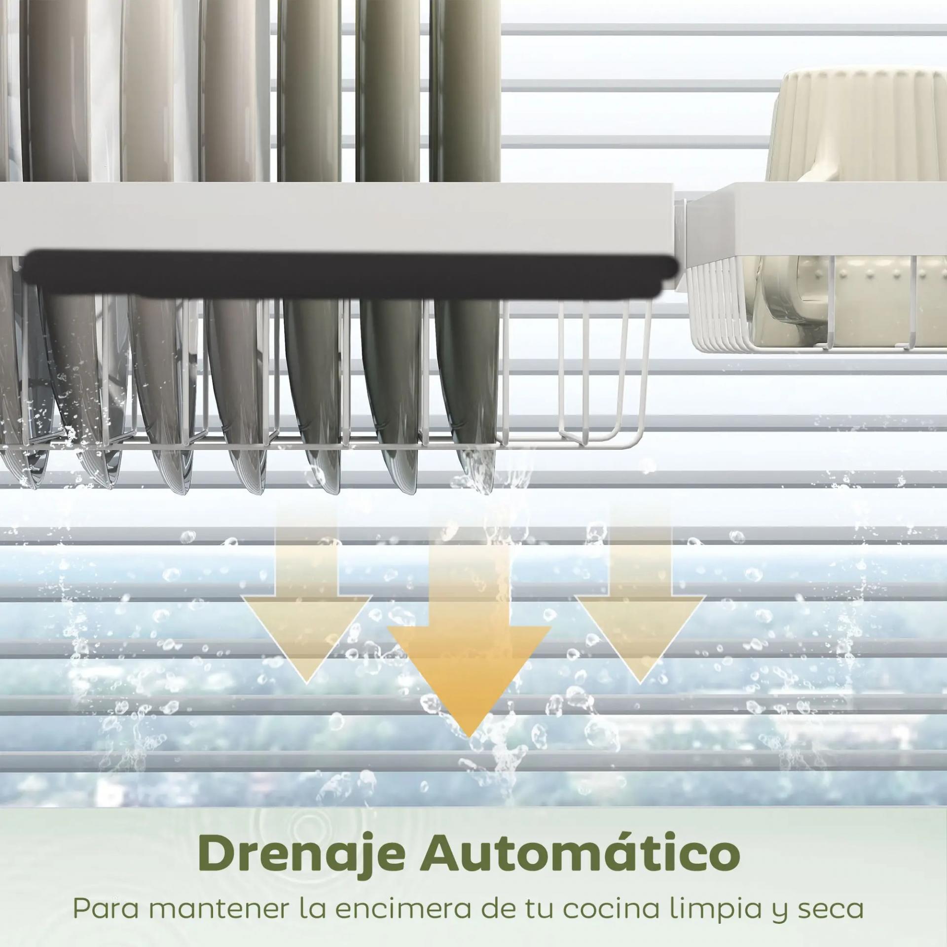 - ESCURRIDOR DE PLATOS: Este escurridor blanco es ideal para aprovechar el espacio vertical sobre el fregadero, ahorrando así espacio en la encimera. Además, al estar encima del fregadero, el agua caerá al desagüe y no se derramará