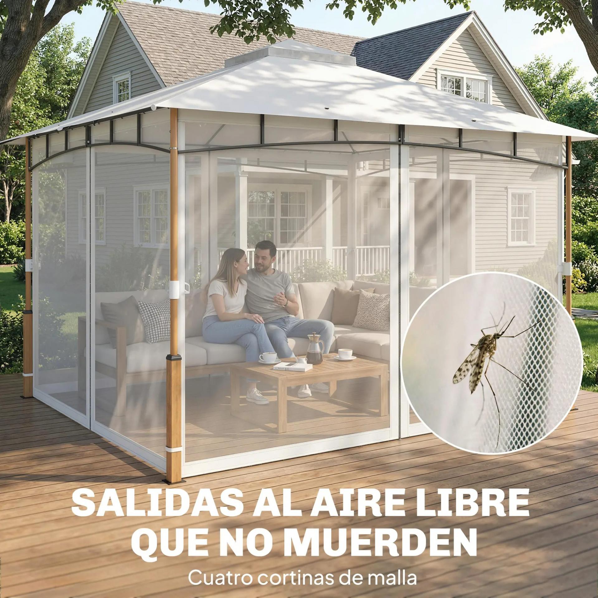 - TECHO DOBLE CON DRENAJE: El diseño de dos niveles mejora la ventilación interior y favorece la salida del aire caliente. Este gazebo incorpora ocho orificios de drenaje que ayudan a evacuar el agua de lluvia, aportando mayor confort en uso exterior prolongado