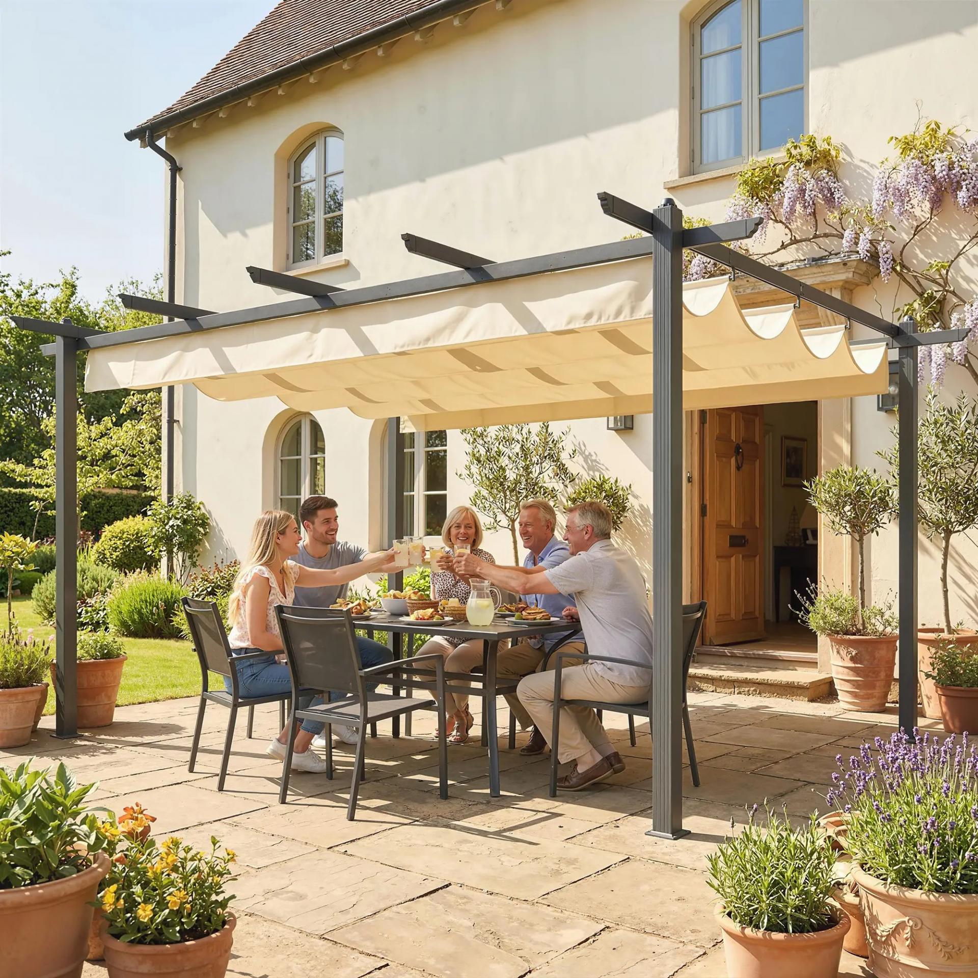 - TECHO CORREDERO: Pérgola de jardín con diseño retráctil que puedes ajustar según tus preferencias. Este techo corredizo proporciona distintos niveles de protección solar durante el día, adaptándose a tus necesidades