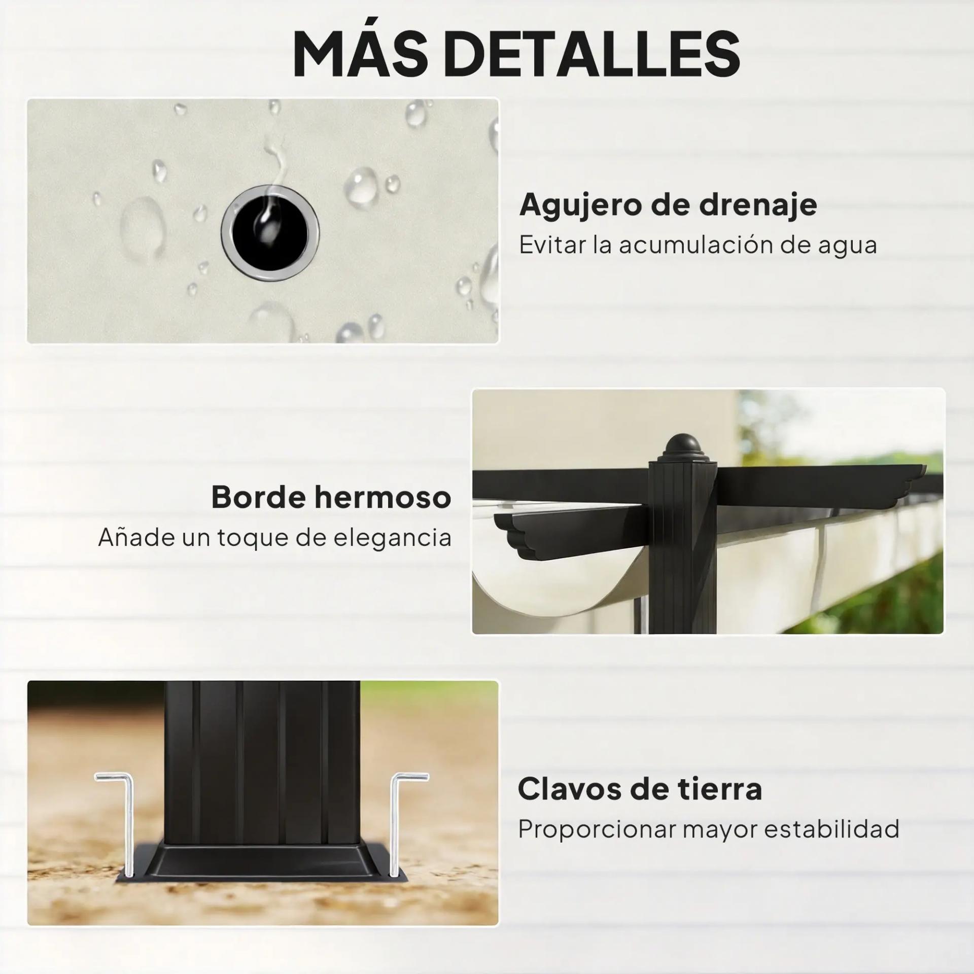 - - OCHO OJALES: Los ojales garantizan un drenaje eficaz del agua, evitando acumulaciones que puedan dañar la estructura o caigan sobre ti. Mantiene la pérgola en perfectas condiciones