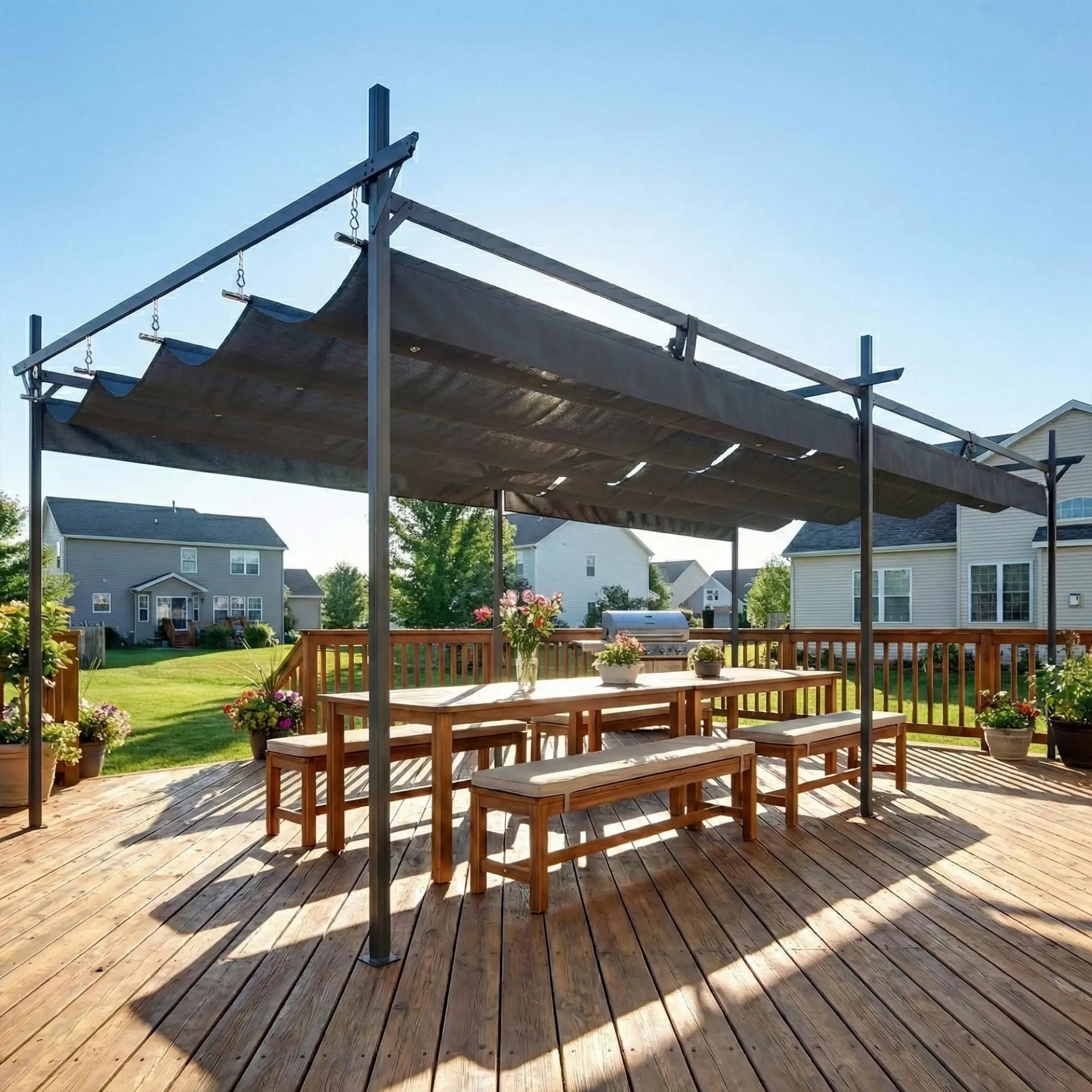 - TOLDO RETRÁCTIL DESLIZANTE: Pérgola con techo móvil que se desliza para regular la sombra según el momento del día. Permite elegir entre sol o sombra parcial, mejorando la ventilación y adaptándose de forma práctica a tus necesidades en exterior