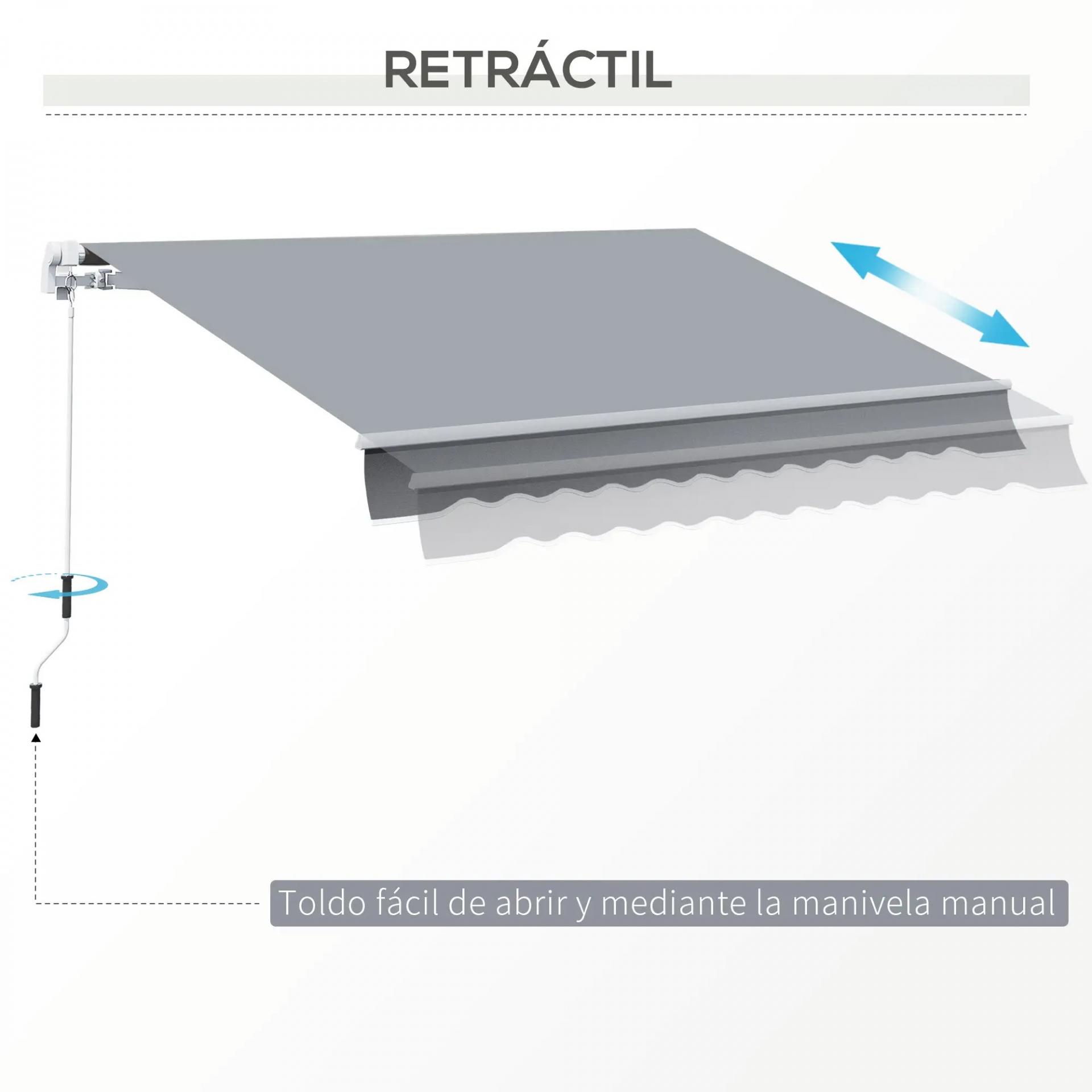 - MEDIDAS TOTALES: 295x245 cm (LxAN). Longitud de manivela 150 cm. Toldo recomendado para la incidencia de luz solar y no para condiciones meteorológicas adversas. La instalación es responsabilidad del comprador. Requiere montaje. Nota: Si llueve mucho puede acumularse agua en el tejido del toldo y causar daños, por lo que debes recogerlo