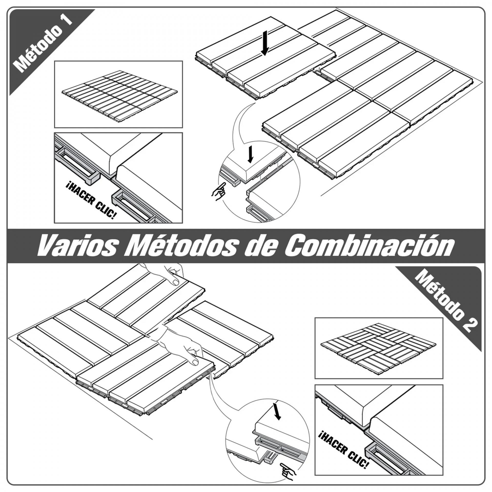 - SISTEMA DE CLIC: Instala de forma rápida y fácil estas baldosas terraza exterior que se acoplan unas con las otras mediante un sencillo sistema de encaje, para montarlas según tus necesidades y zona a cubrir en cuestión de minutos