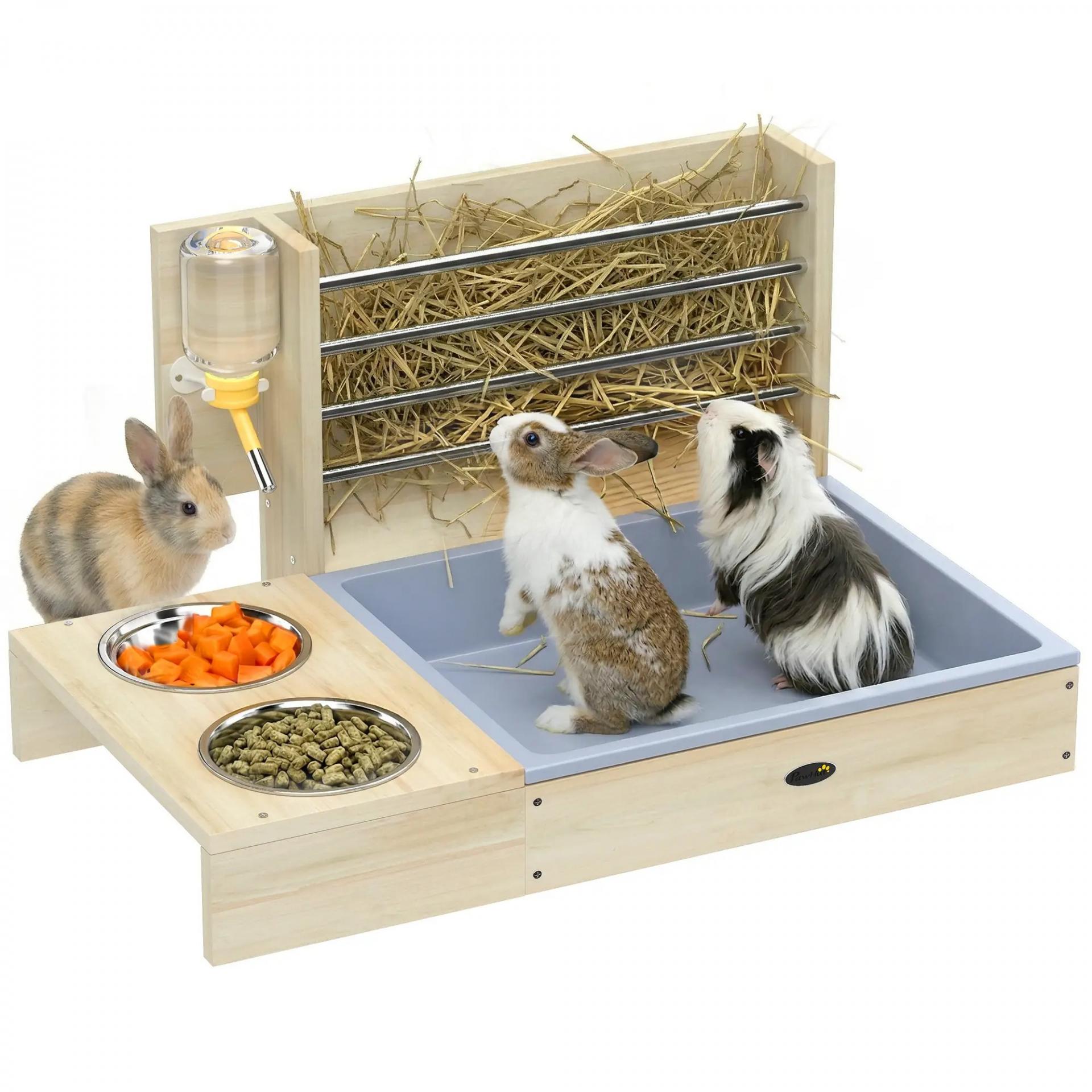 Comedero de Heno de Conejos con Bandeja Alimentador de Heno de Madera con Cuenco de Acero Inoxidable y Botella de Agua