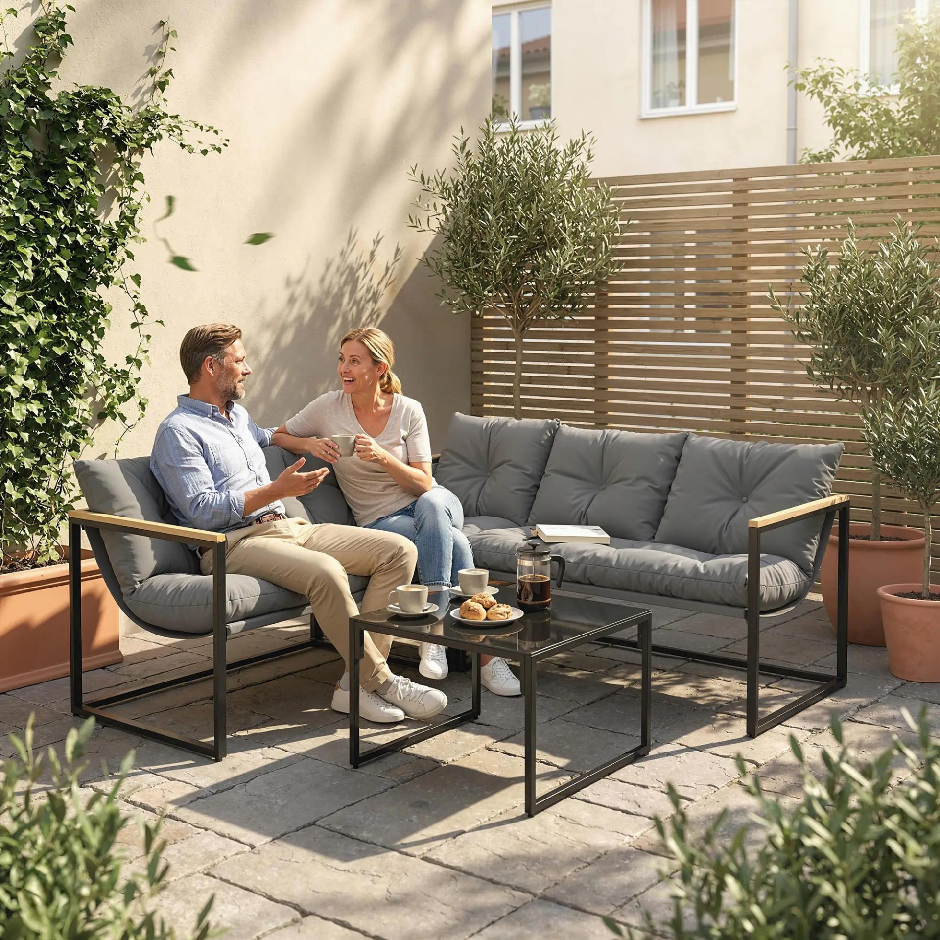 - MESA CON VIDRIO TEMPLADO RESISTENTE: Mesa de centro de 65x65 cm con superficie de vidrio templado serigrafiado, fácil de limpiar y apta para bebidas y aperitivos, aportando funcionalidad y estilo al conjunto de terraza- - ESTABILIDAD Y SEGURIDAD CERTIFICADAS: Sofá exterior con patas ajustables (0,1–0,7 cm) que permiten nivelar el conjunto en suelos irregulares; cumple normas EN581-1&2, EN581-1&3 y EN12150 para mayor garantía de uso exterior