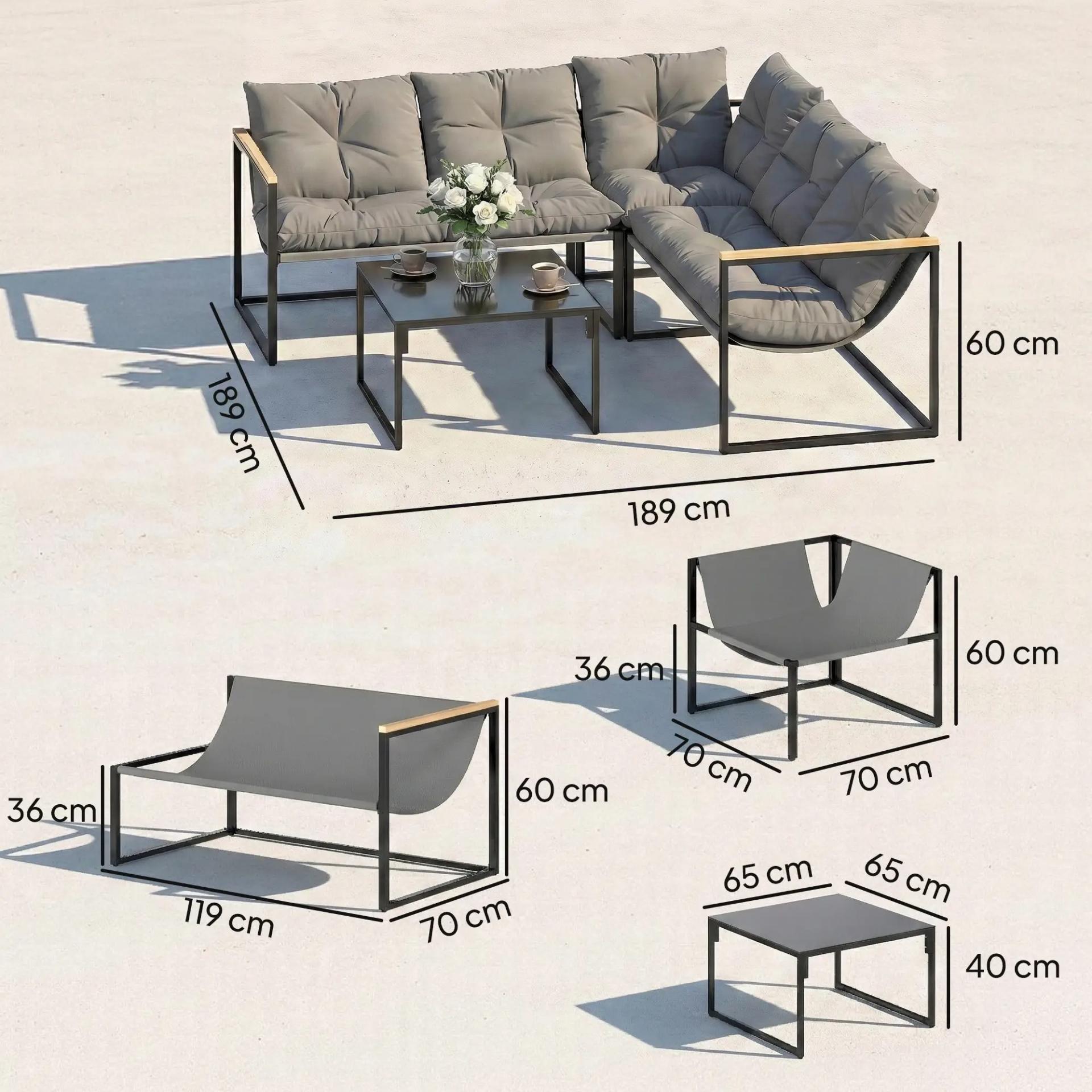 - CONJUNTO DE JARDÍN EN L DE 4 PIEZAS PARA 5 PERSONAS: Este conjunto de jardín incluye dos sofás dobles, un módulo de esquina y una mesa de centro, formando una amplia zona chill out de 189x189 cm. Sus módulos independientes permiten adaptar la disposición al espacio disponible