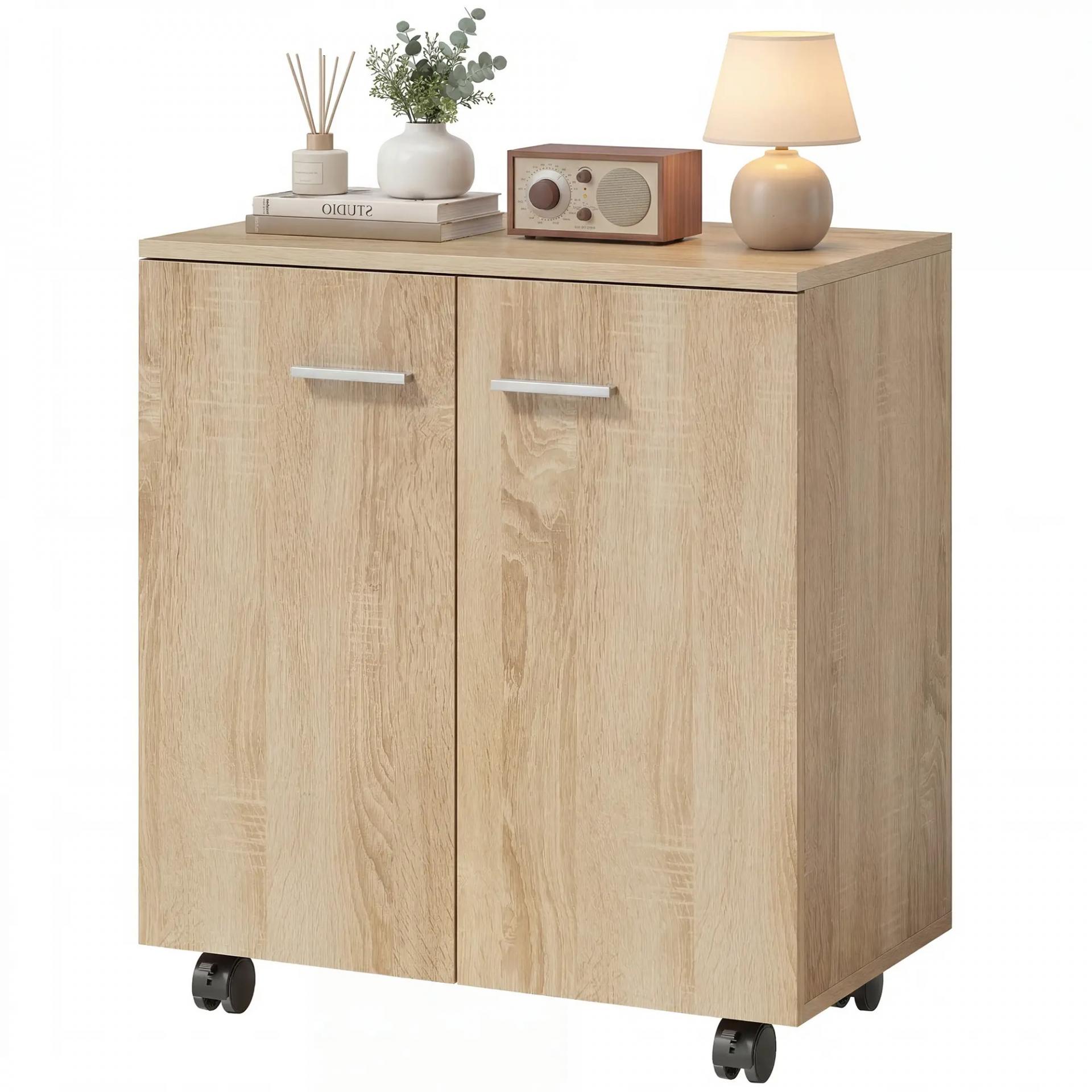 Aparador de Salón conRuedas 2 Puertas y Estantes para Sala de Estar Dormitorio Oficina 60x35x65 cm Natural