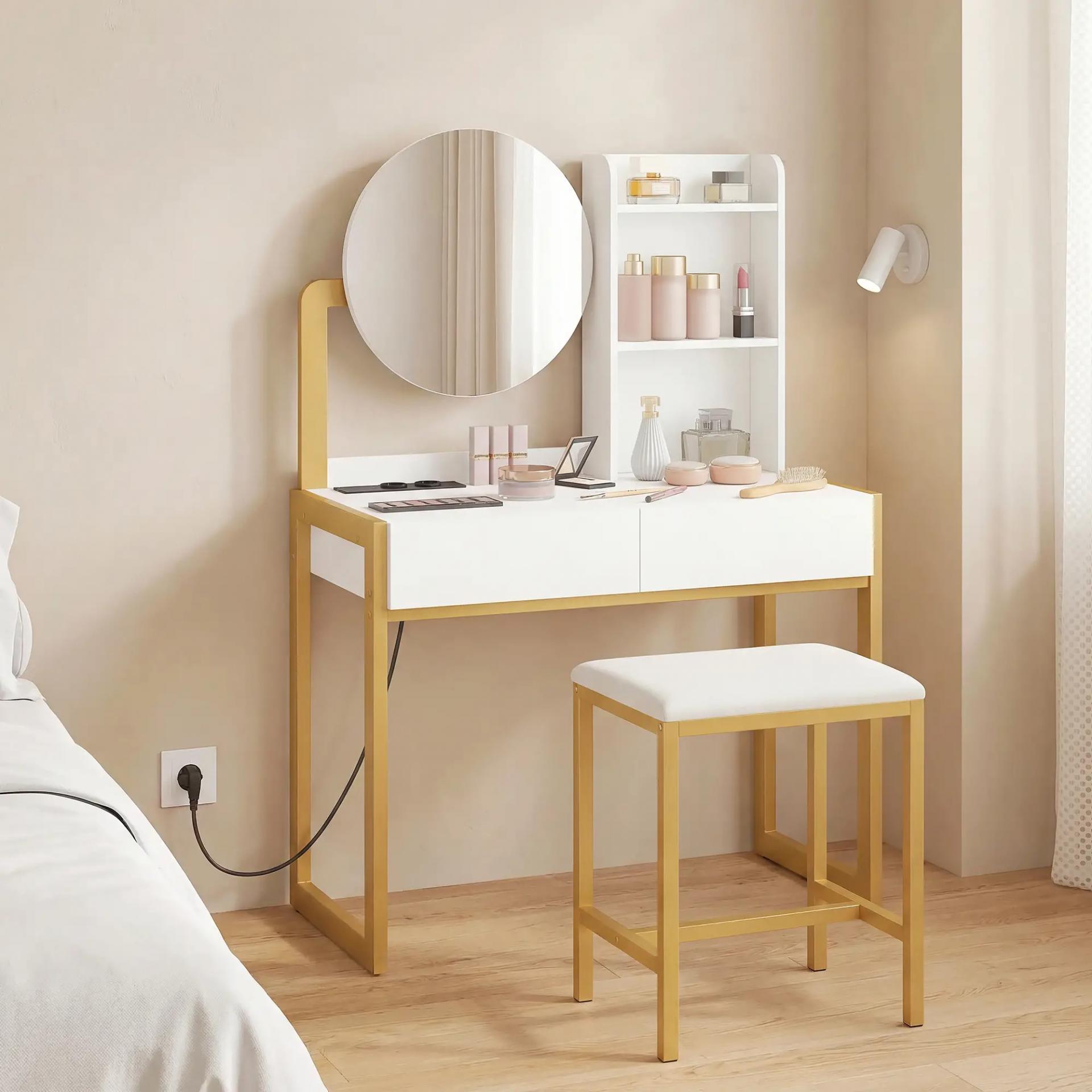 - - CONJUNTO MODERNO Y COMPLETO: Este tocador blanco y dorado incluye un taburete acolchado con tejido de tacto lino, combinando estilo y comodidad para crear un espacio elegante donde maquillarte, peinarte o prepararte cada mañana con más confort