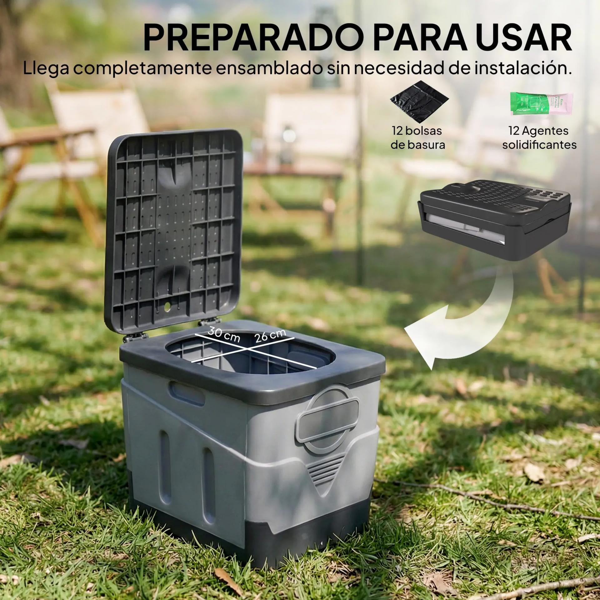 - - LISTO PARA USAR DESDE LA CAJA: Este inodoro portátil llega completamente montado, sin necesidad de instalación. Incluye 12 paquetes de agente solidificante y 12 bolsas de basura, listo para usar de inmediato en viajes largos, campamentos o emergencias en casa