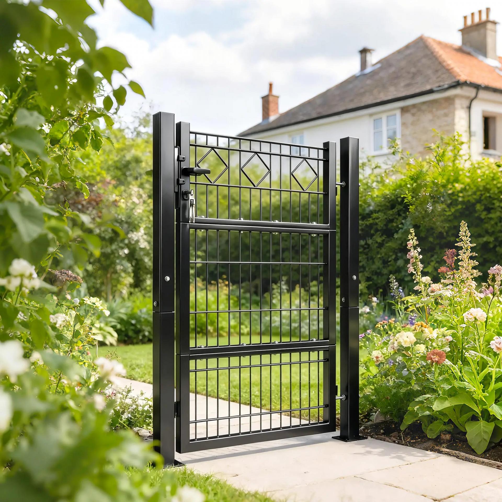 - - DISEÑO SIMPLE Y VERSÁTIL: El diseño clásico de malla de esta puerta para exterior se integra perfectamente con jardines, patios o cercas, aportando un toque elegante y sofisticado que mejora la estética de cualquier espacio exterior