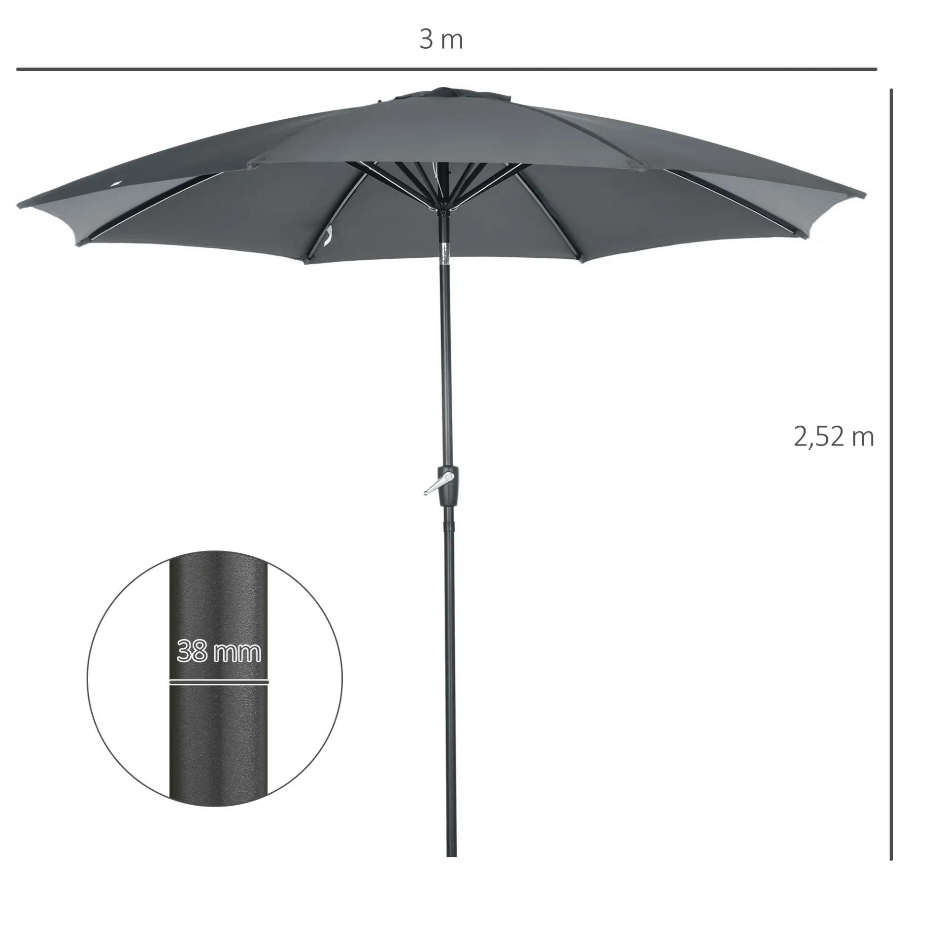 - - MEDIDAS TOTALES: Ø300x252 cm (DxAL). NOTA: Requiere una base de 40 kg si está solo. Referencia base recomendada: 84D-143. Cuando se usa con una mesa con orificios para sombrilla, se requiere una base de 15 kg. Referencia base recomendada: 84D-076. Póngase en contacto con el servicio de atención al cliente para obtener enlaces de productos si necesita uno. No utilizar en condiciones climáticas adversas (viento fuerte, lluvia intensa o nieve). Se requiere montaje