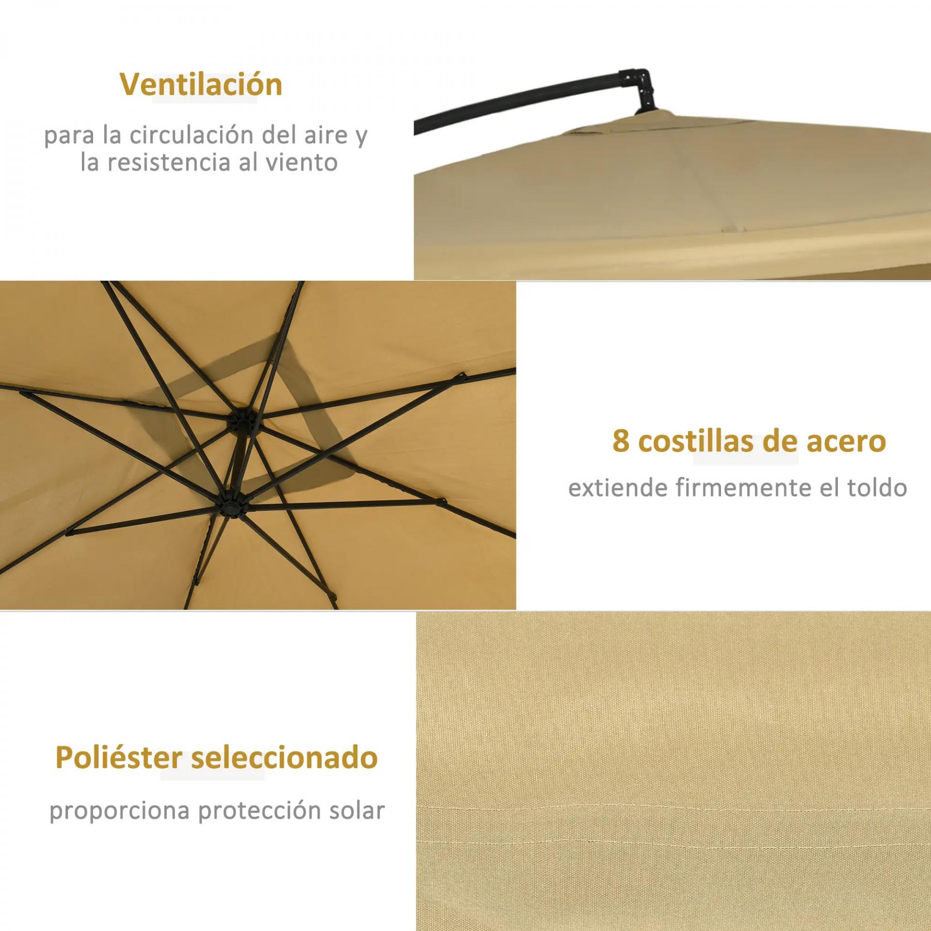 - SOMBRILLA EXCÉNTRICA: Sombrilla Cantilever ideal para jardines, piscinas y terrazas. Con grandes dimensiones, acomoda una mesa con 6-8 sillas, ofreciendo un espacio cómodo para tus invitados en exteriores como restaurantes o cafeterías