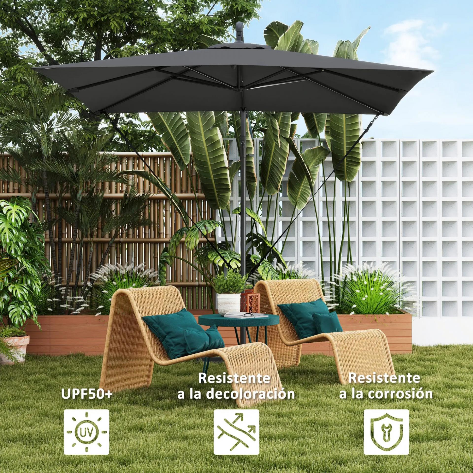 - - MATERIALES DE CALIDAD: Fabricada en poliéster de 180 g/m² con revestimiento de PU, esta sombrilla excéntrica resiste la decoloración y ofrece protección UV UPF 50+. Además, el mástil con recubrimiento en polvo previene la oxidación