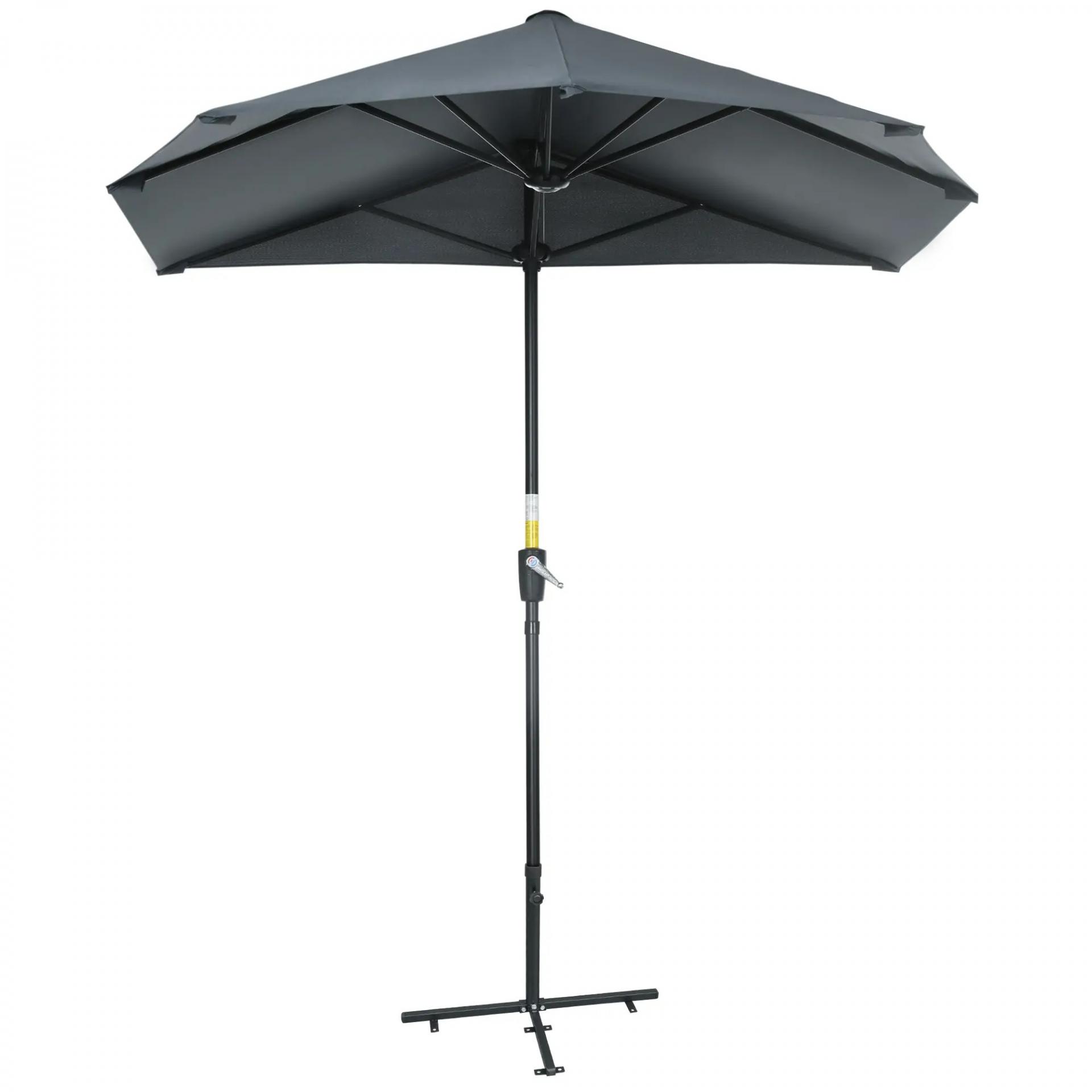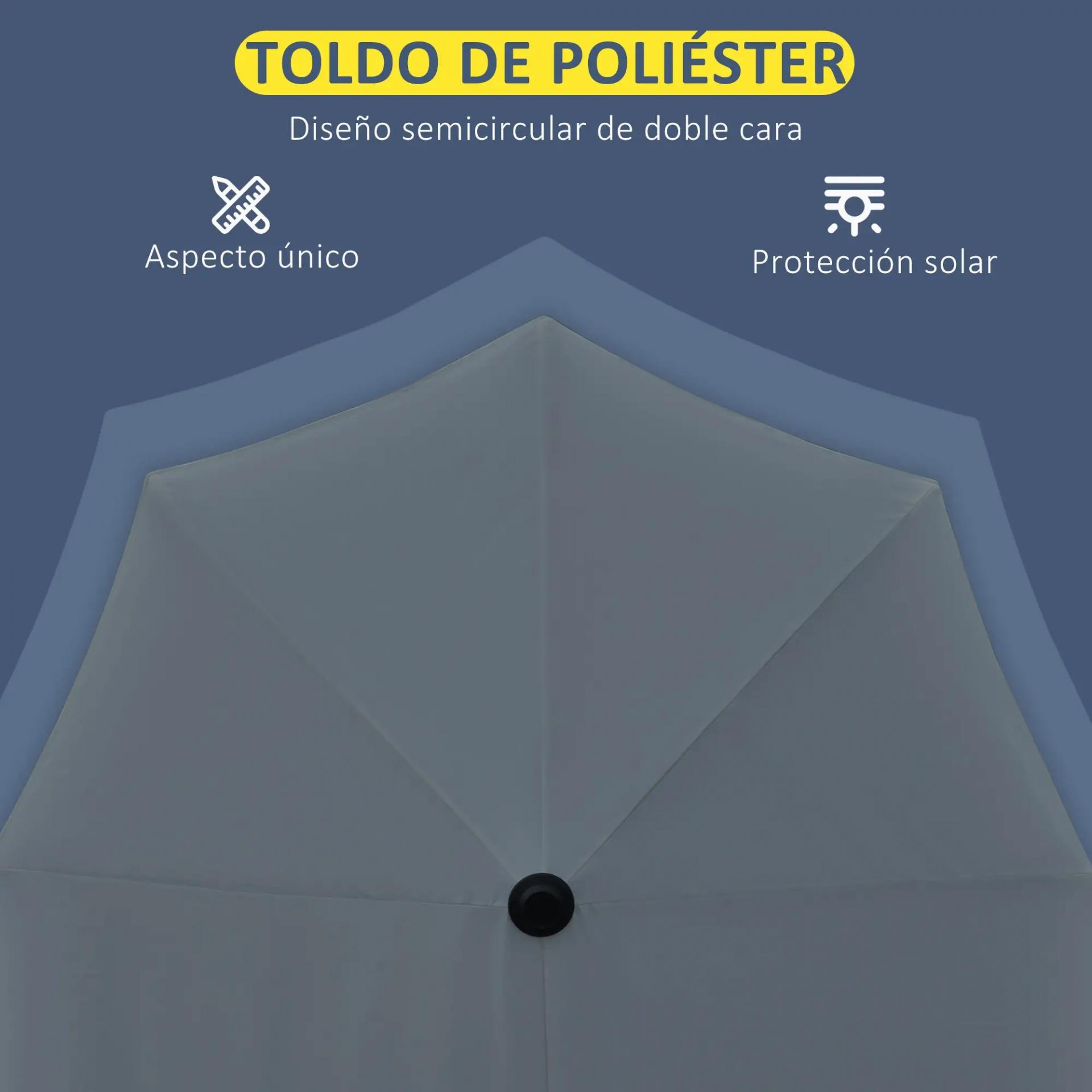 - SOMBRILLA SEMICIRCULAR: Este parasol semicircular es ideal para colocarlo a ras de una pared o puerta de cristal y disfrutar de una zona de sombra en tu jardín, terraza, patio, etc. El mástil se puede desmontar fácilmente para facilitar su almacenamiento y transporte