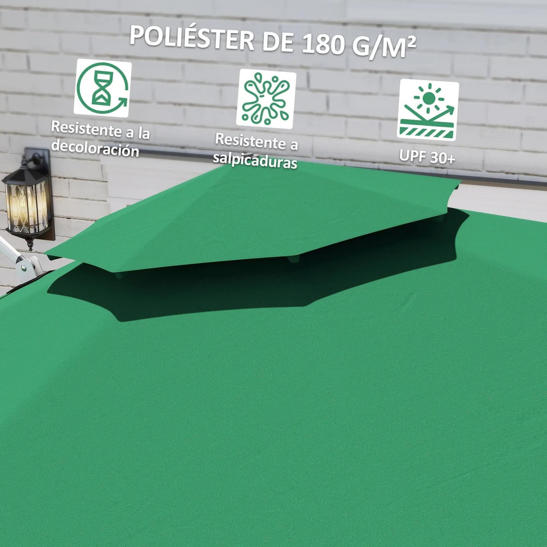 Parasol Excéntrico Ø292 cm con Manivela Giro 360° Inclinación Ajustable Doble Techo y Base Cruzada Verde Oscuro