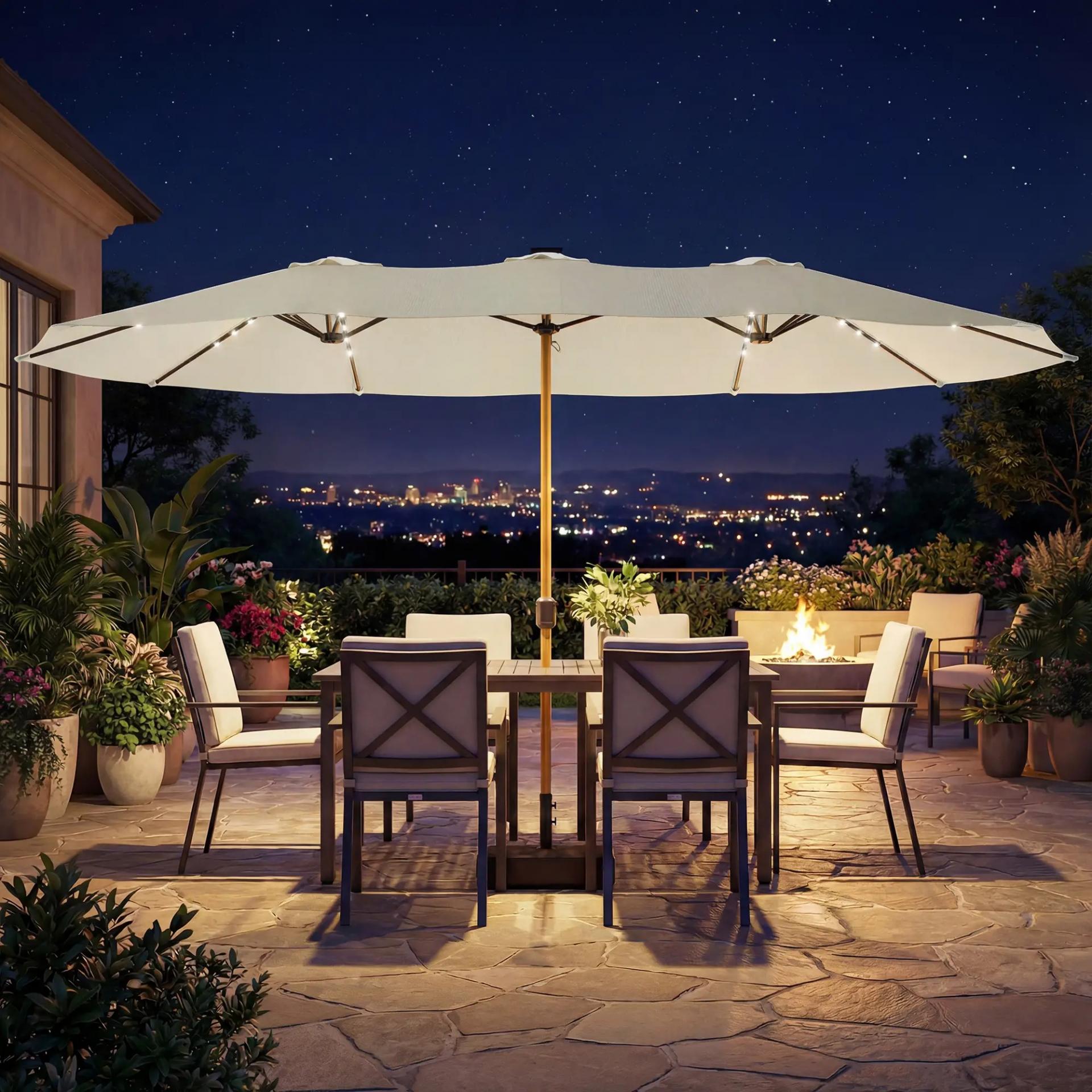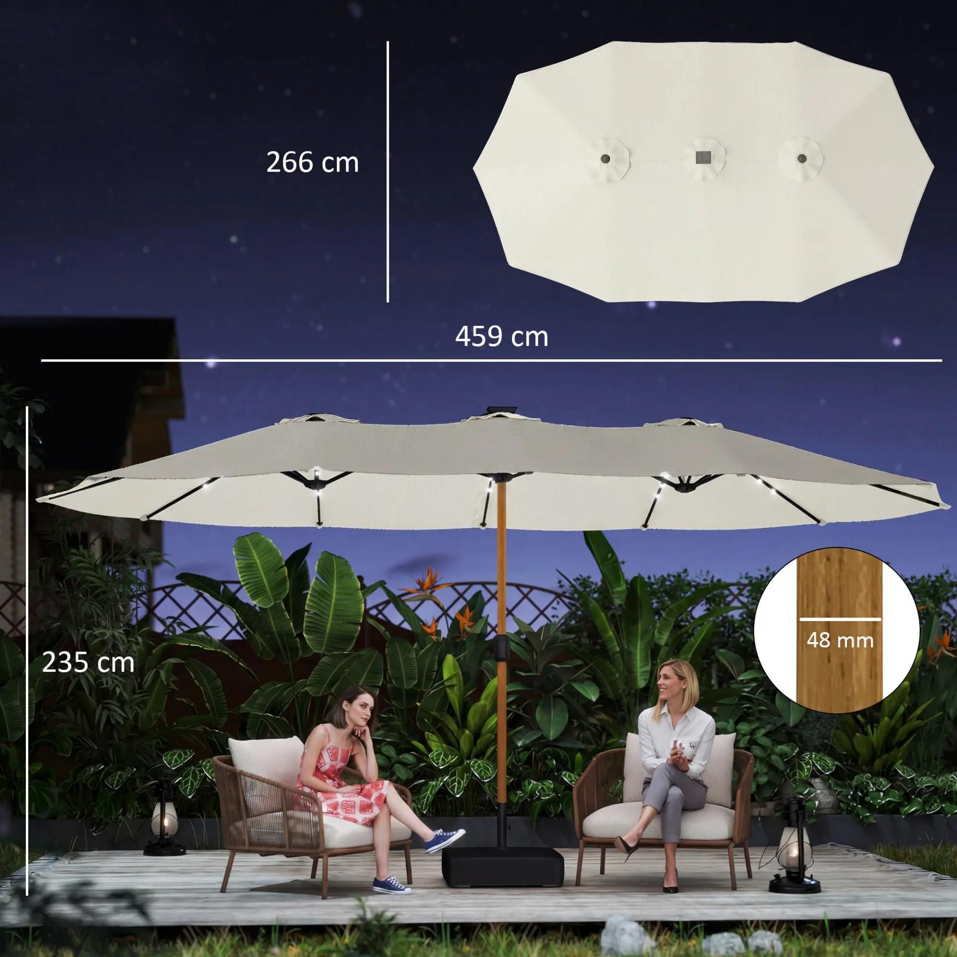 Sombrilla Doble de Jardín 4,6x2,6 m con 48 Luces LED Base Incluida Manivela Sacos de Arena Anti-UV Crema