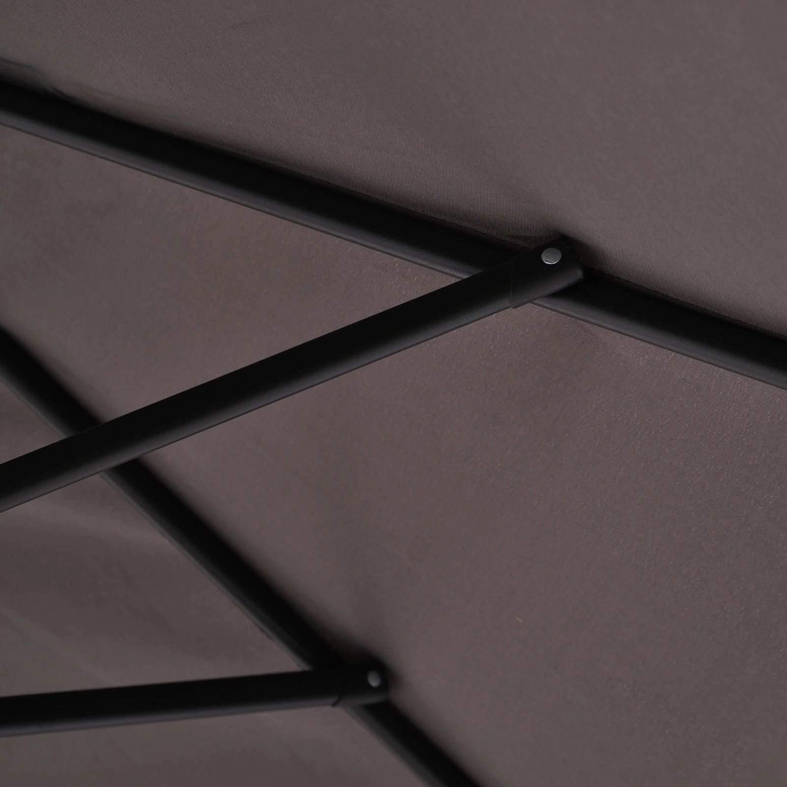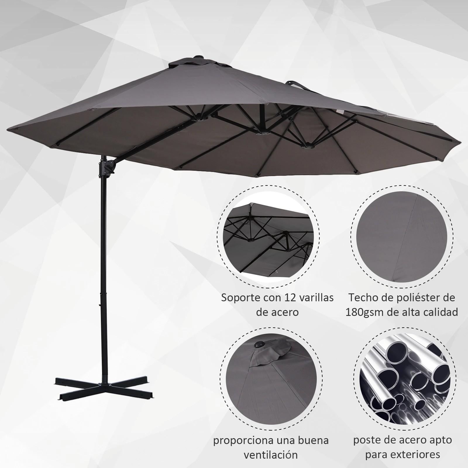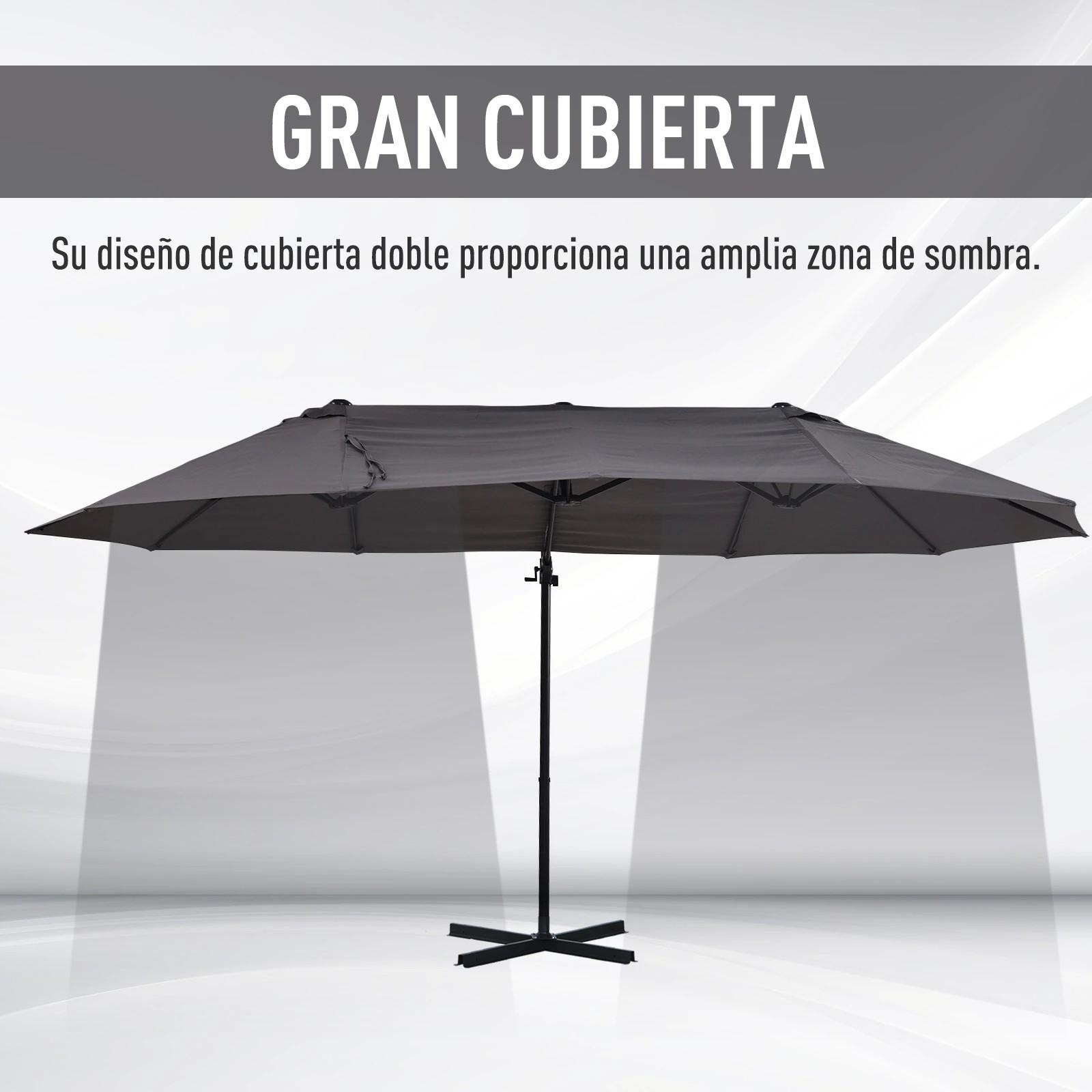 - SOMBRILLA DOBLE: Esta elegante sombrilla de grandes dimensiones con una longitud de 4,45 metros y 2,6 metros de ancho, proporcionará una gran zona de sombra en cualquier espacio exterior como el jardín o terraza de tu hogar