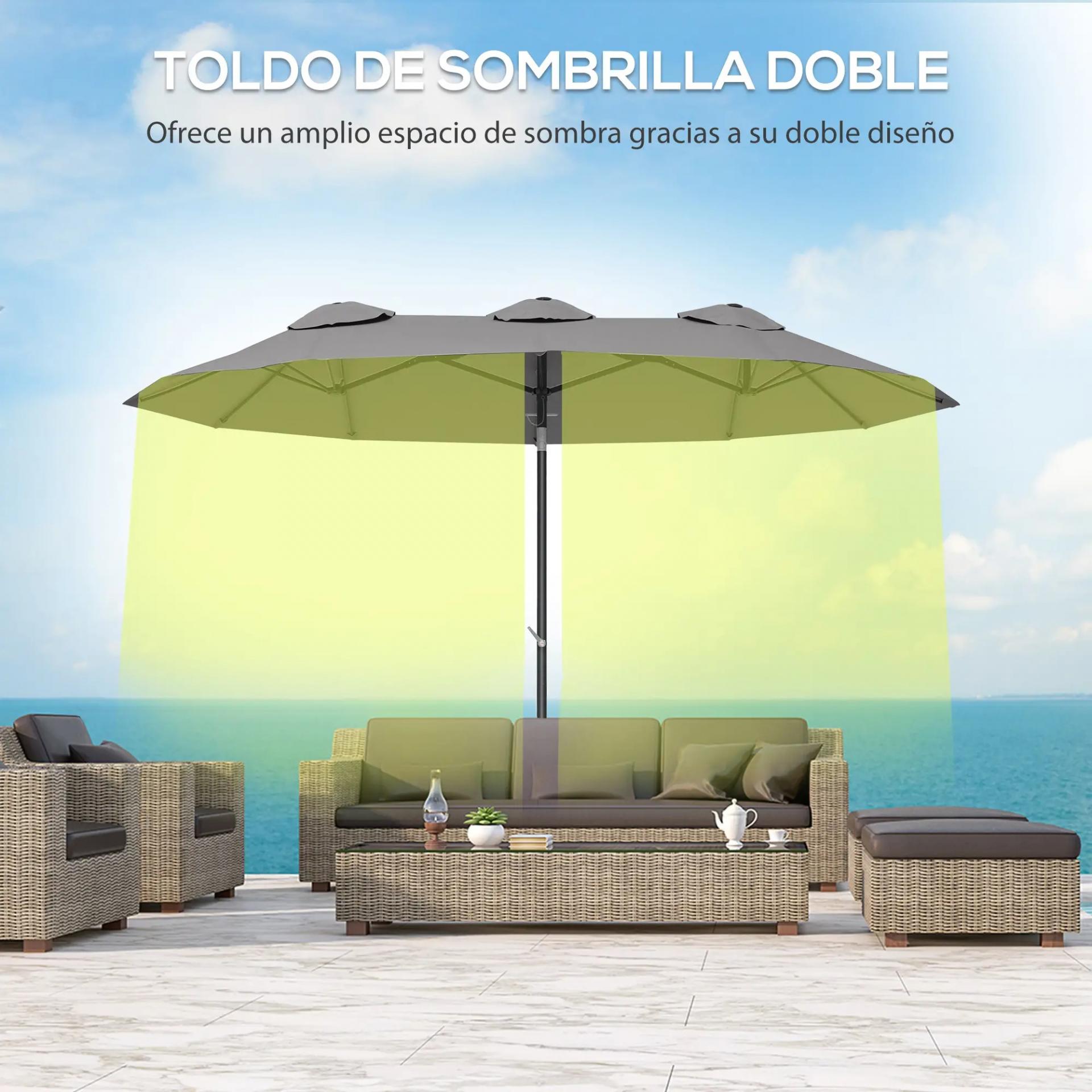 - SOMBRILLA DOBLE: Esta sombrilla de gran tamaño te ofrecerá una gran área de sombra en cualquier espacio al aire libre, como el jardín o terraza de tu hogar. Es perfecta para sentarte cómodamente y disfrutar de tu tiempo al aire libre con amigos y familia