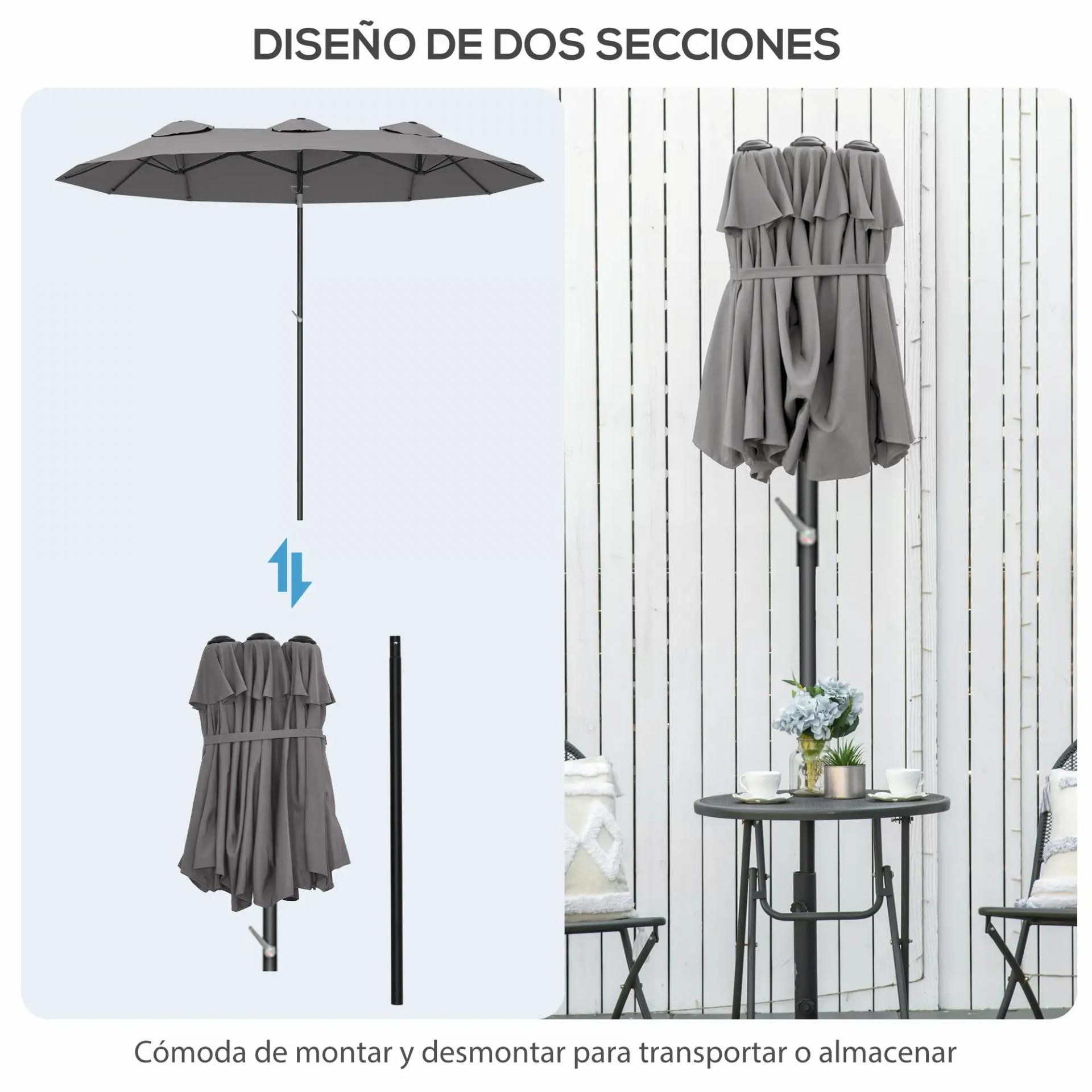 - - ÁNGULO AJUSTABLE Y DESMONTABLE: La parte superior del mástil de esta sombrilla doble se puede inclinar hasta 45 grados para ajustar el toldo de acuerdo a la incidencia de los rayos del sol. El mástil se desmonta para facilitar el transporte y almacenaje