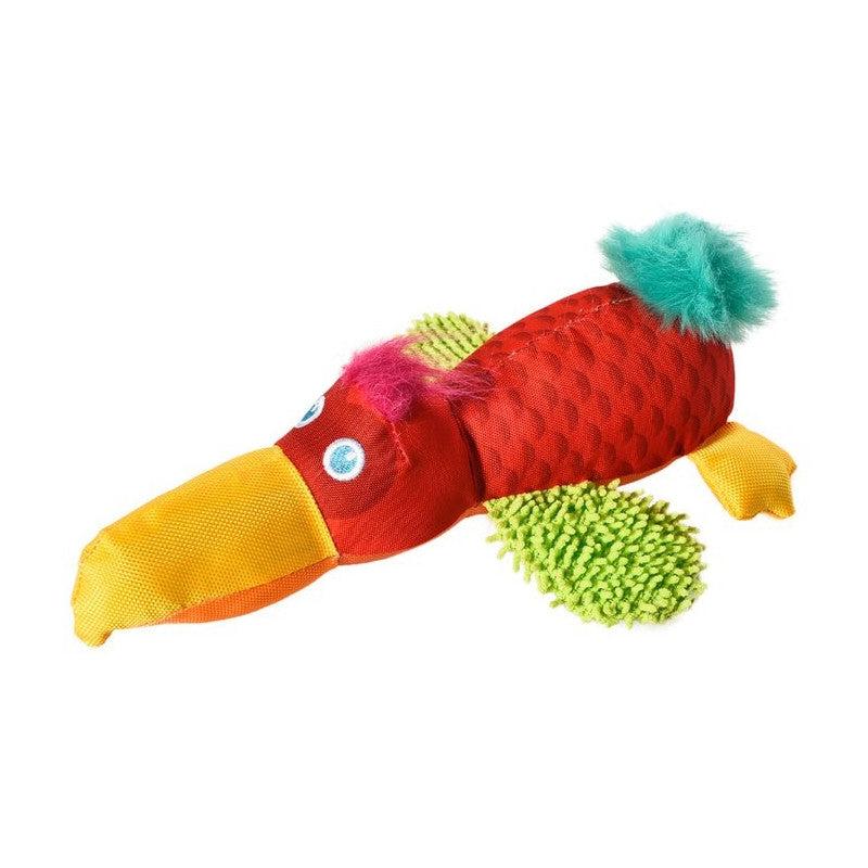 Juguete de peluche con forma de loro para perros • Diseño colorido que estimula el interés y el juego • Fabricado en material suave, ideal para morder y transportar • Ligero y fácil de manejar para perros de distintos tamaños • Apto para juego interactivo o entretenimiento individual • Recomendado para perros que prefieren juguetes blandos