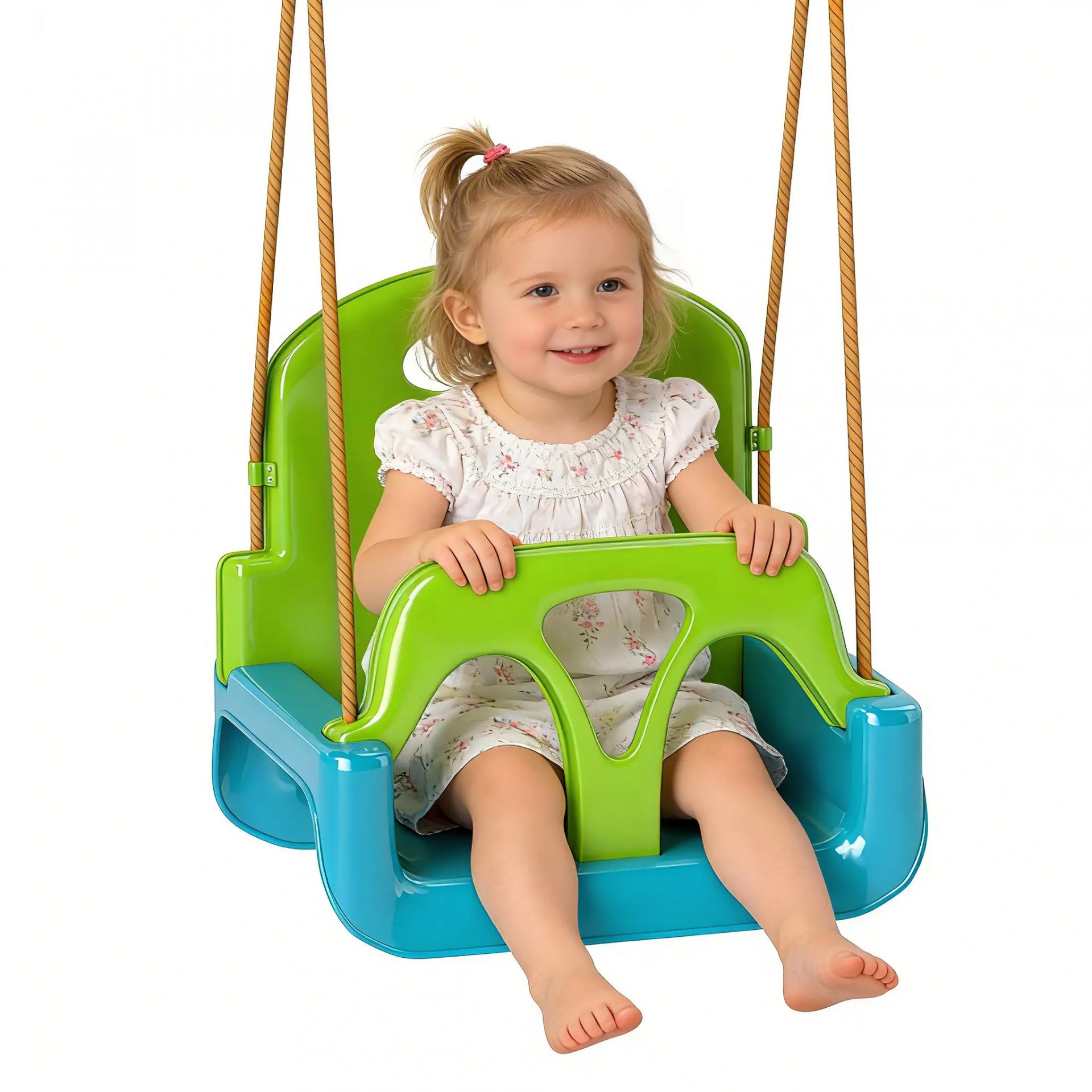 - DISEÑO 3 EN 1: Columpio infantil evolutivo para que se pueda adaptar al crecimiento de tu bebé. Al tener el respaldo y la barra en T frontal desmontables, podrás poner o quitar estos 2 elementos para conseguir el columpio más adecuado en cada etapa