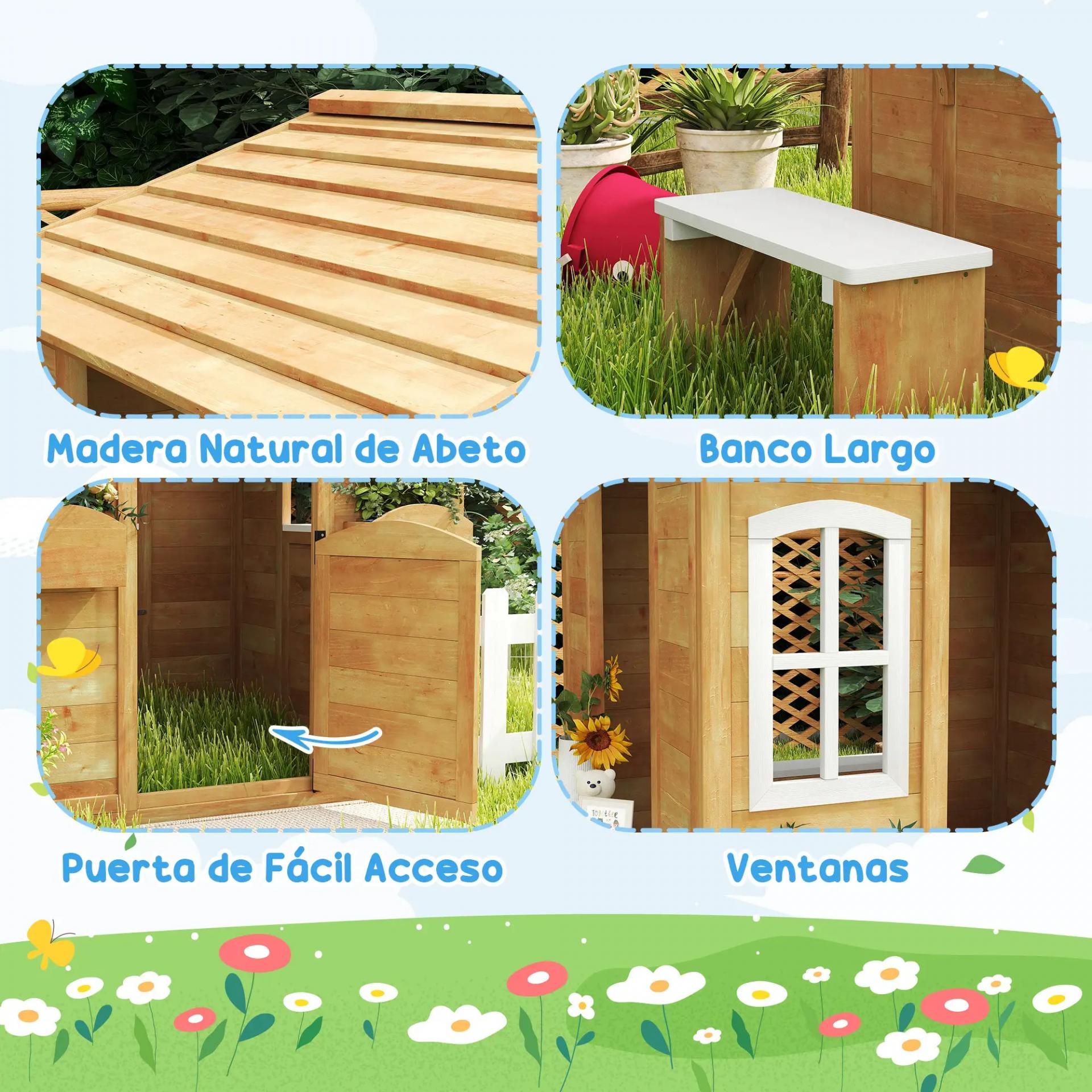 - - ESTRUCTURA RESISTENTE: Casa de juegos de madera de abeto natural con revestimiento impermeable para mayor resistencia a la intemperie. Ideal para jardín, patio u otro espacio exterior