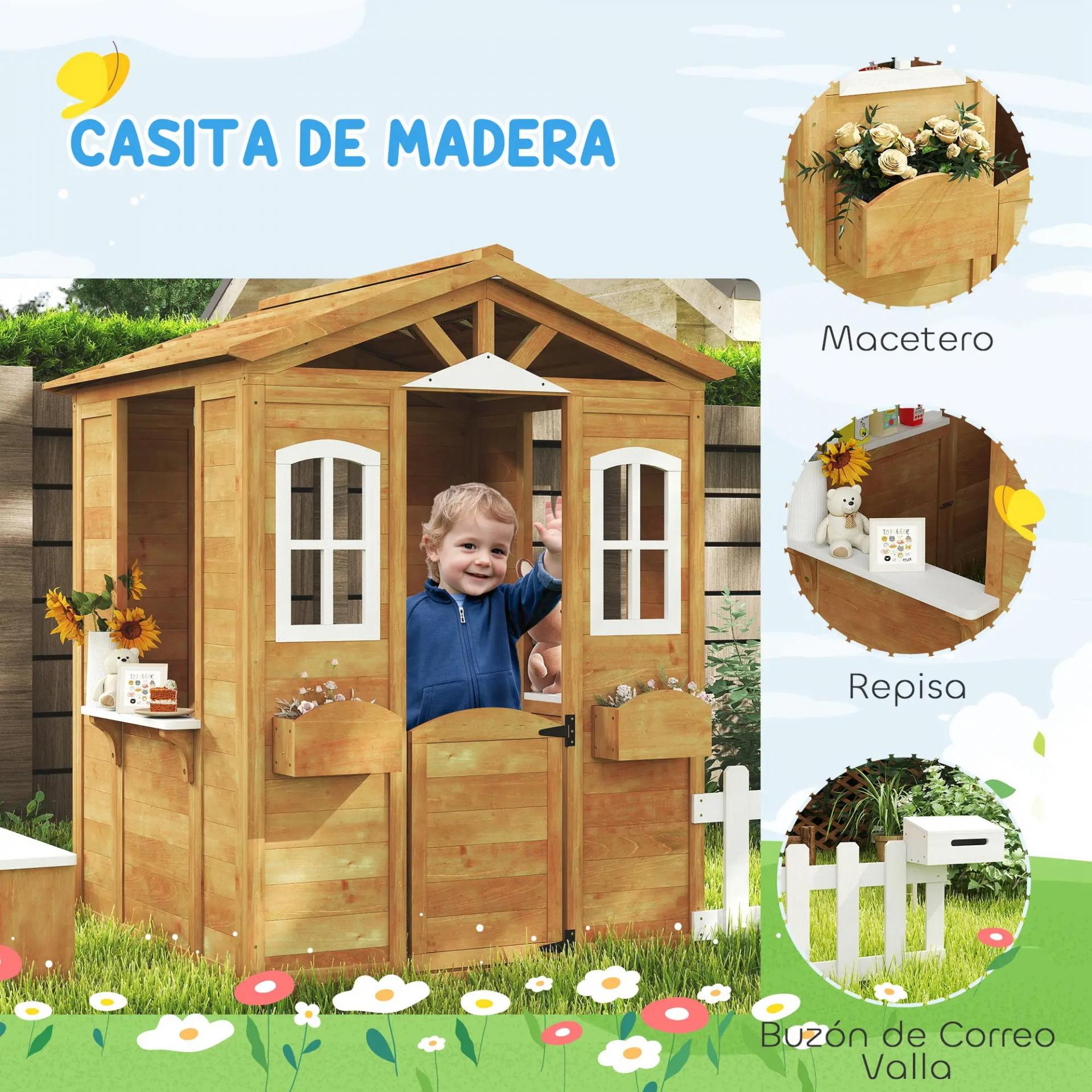 - CASITA DE MADERA PARA NIÑOS: Equipada con puerta, ventanas, buzón, jardineras, valla y banco, esta casita infantil de jardín será el lugar perfecto para que jueguen y se diviertan