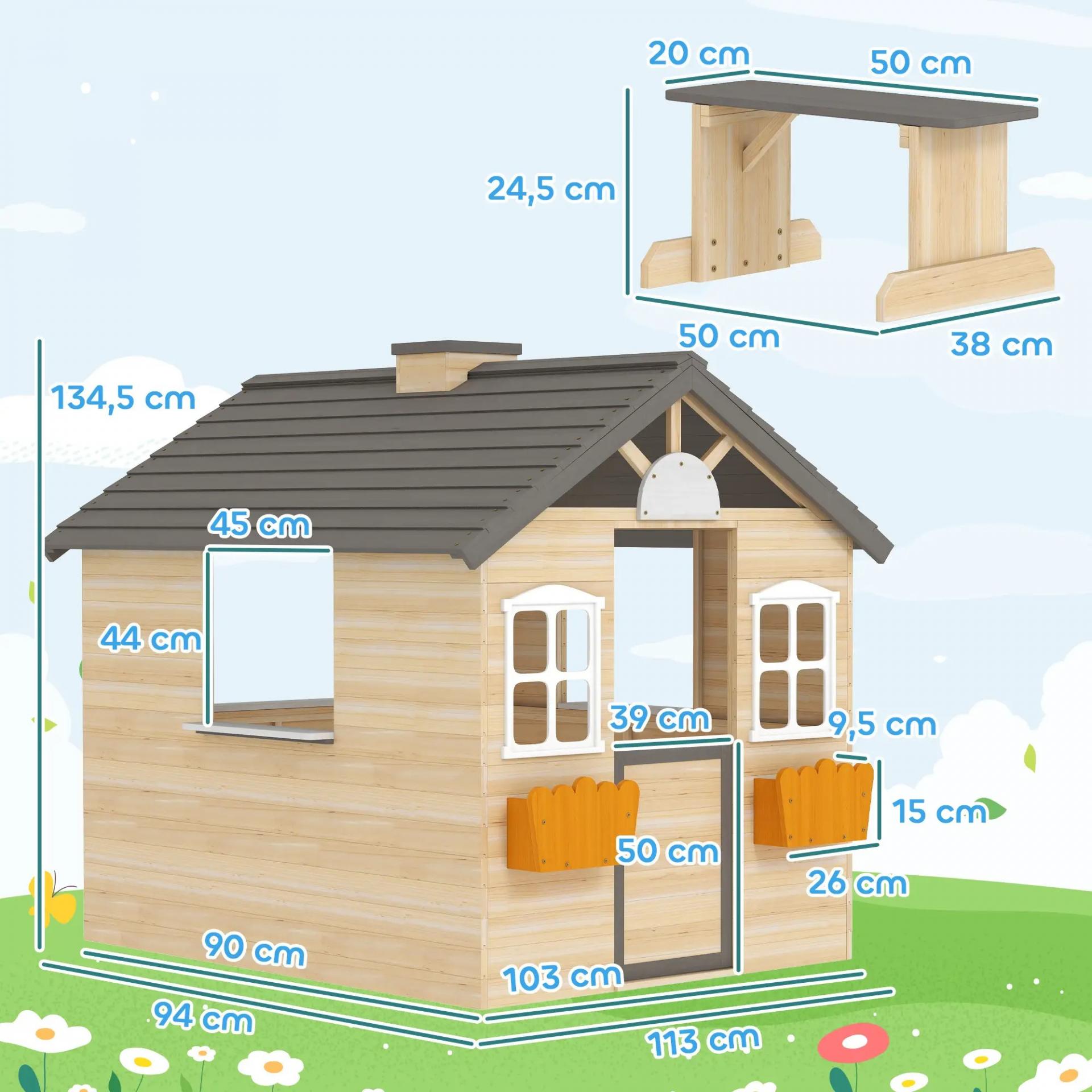Casita Infantil de Juegos Exterior para Niños de 3 -7 Años con Ventanas 2 Jardineras y 1 Banco 113x94x134,5 cm Natural