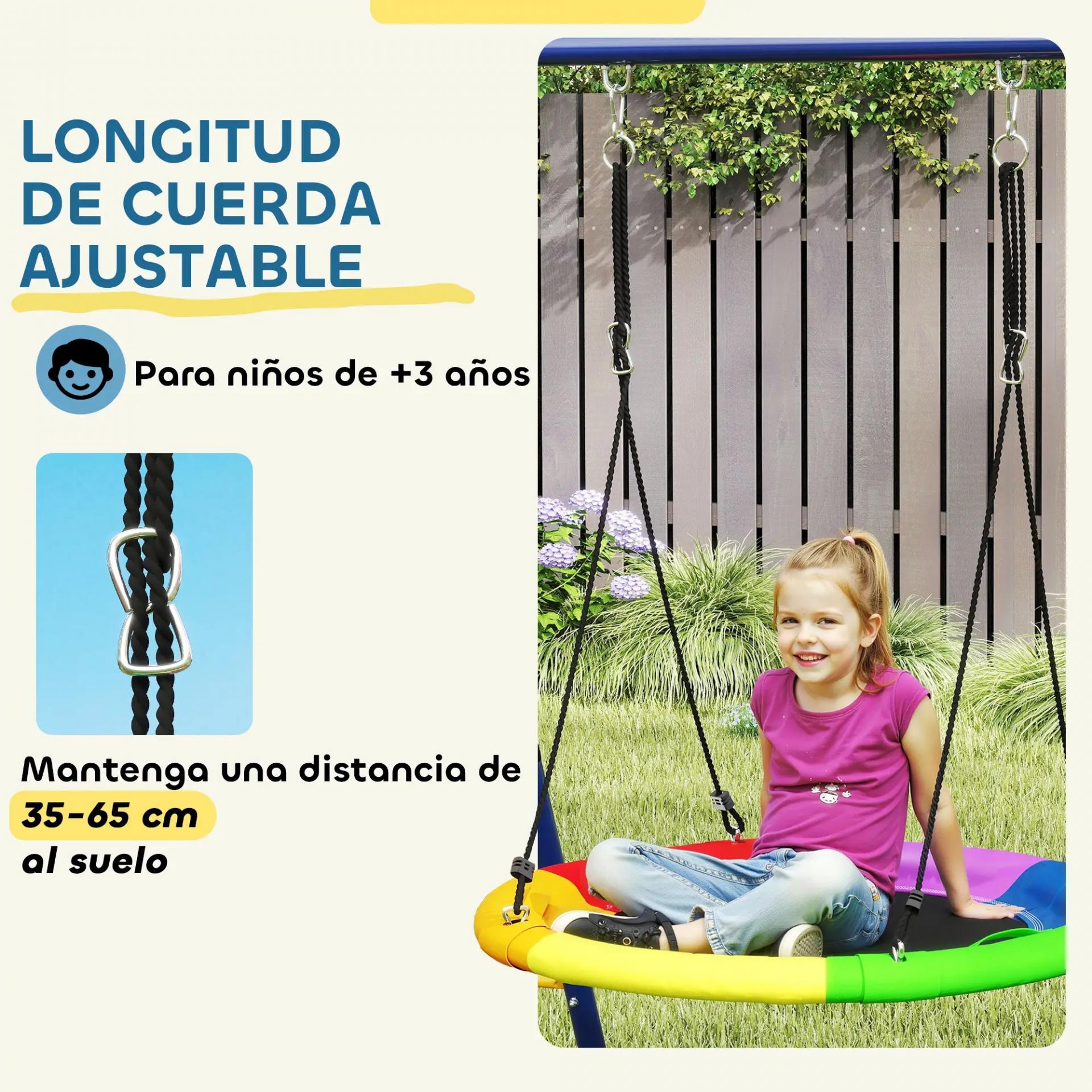 - CONJUNTO DE COLUMPIOS SEIS EN UNO: Incluye columpio simple, uno tipo nido, cuerda con disco, red para escalar, escalera y canasta de baloncesto. Seis opciones para que hasta cuatro niños disfruten de horas de diversión al aire libre