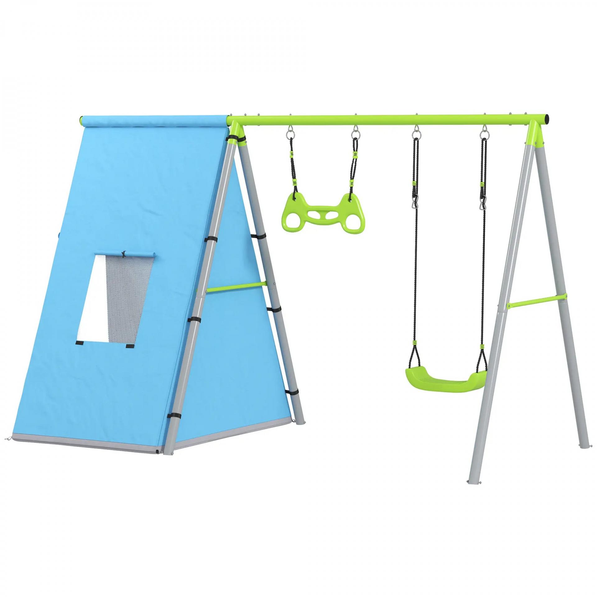 - - RESISTENTE Y SEGURO: Centrado en la seguridad, su estructura metálica en forma de A y las estacas de fijación aseguran que tanto el columpio como la tienda se mantengan estables durante el juego. Soporta hasta 90 kg, proporcionando una gran durabilidad