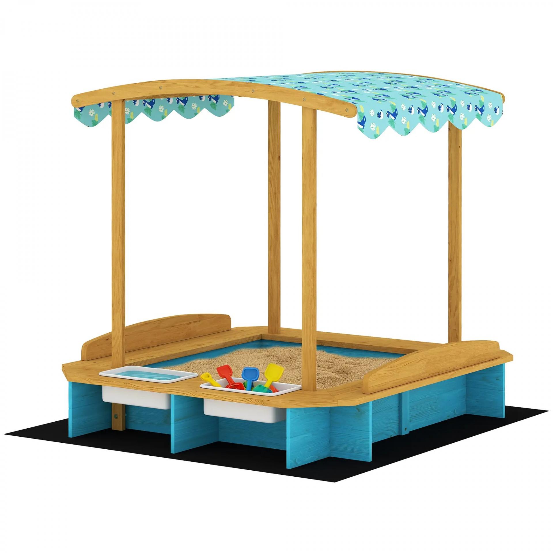 Arenero para Niños de Madera con Techo 3 Bancos 2 Cajas de PP Forro para Niños de 3-6 Años 128x118x121 cm Azul