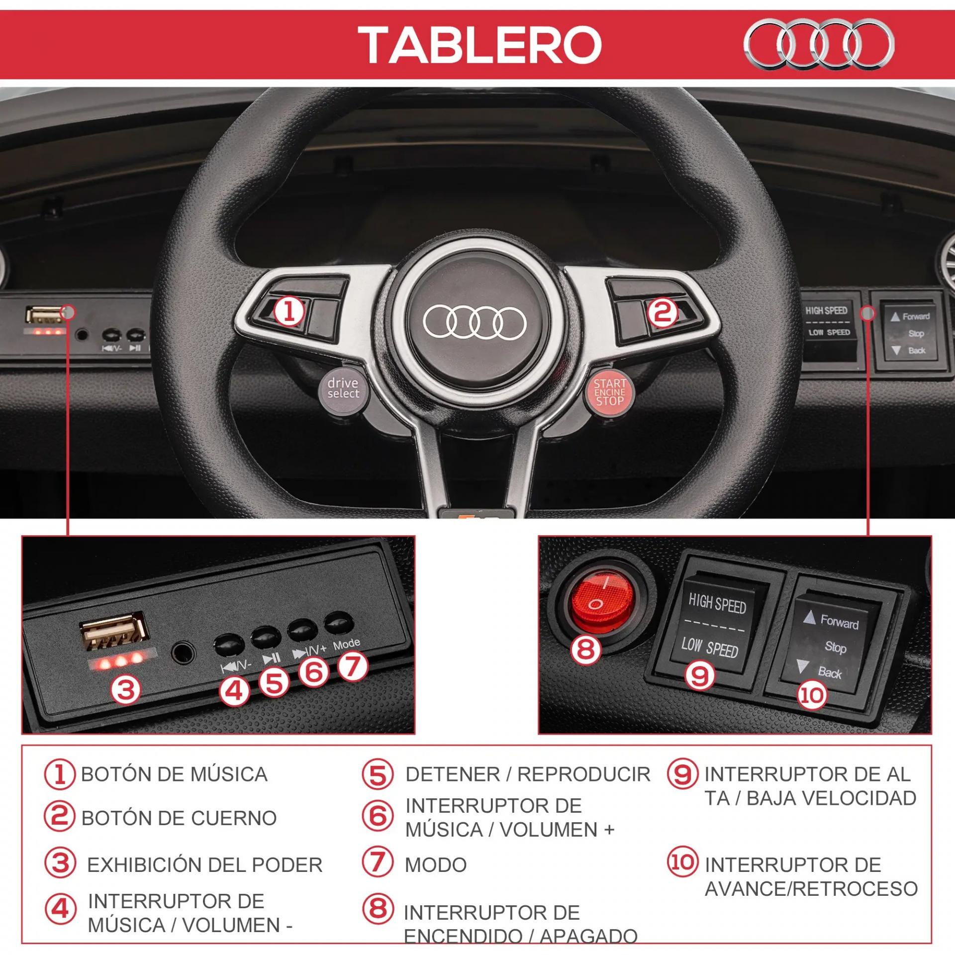 - CONDUCCIÓN CON MANDO A DISTANCIA; Este Audi TT RS eléctrico incluye un mando 2.4G con tres velocidades. Tus padres pueden guiarte o detener el coche en cualquier momento, mientras tú giras el volante y pedaleas como un verdadero piloto