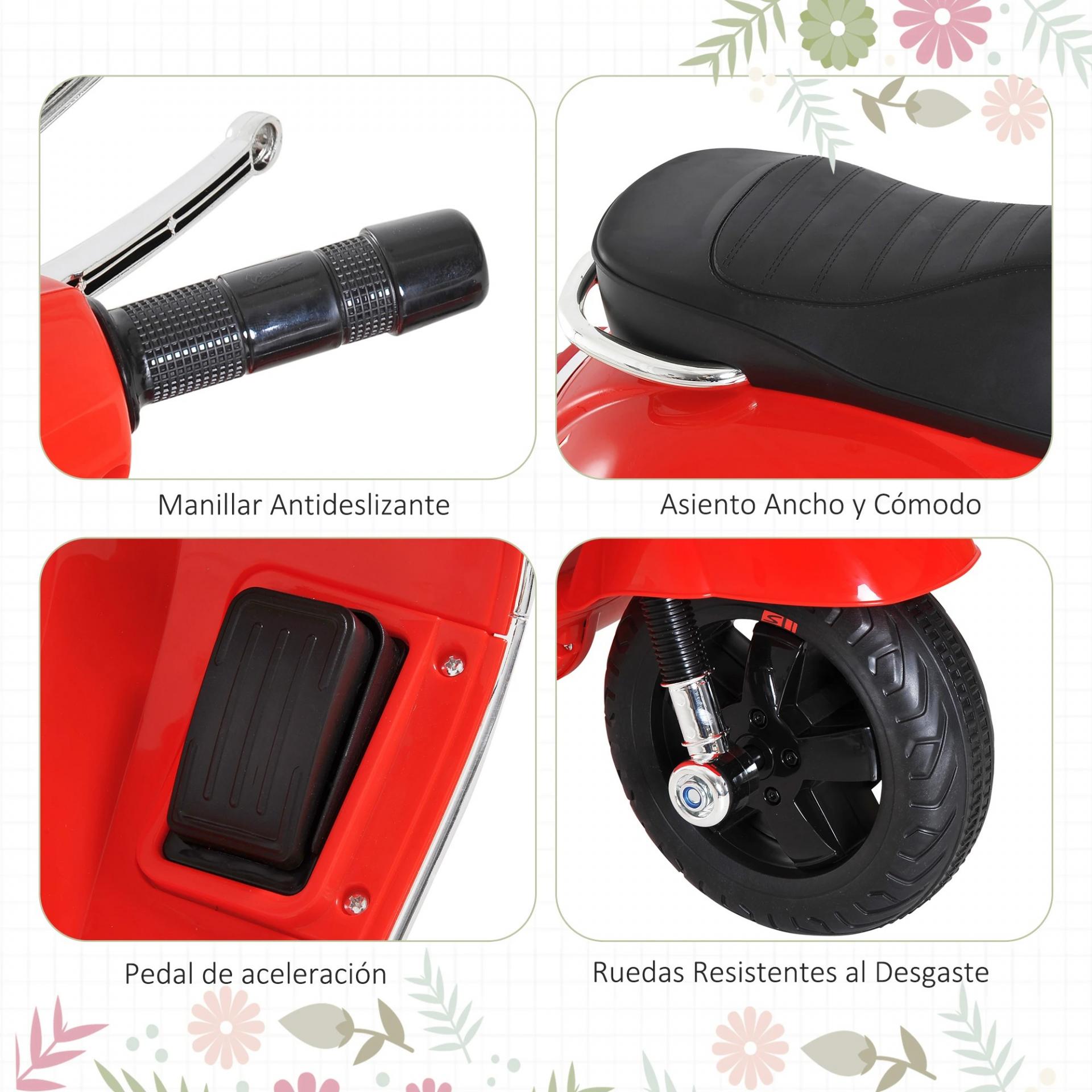 Moto Eléctrica Infantil Coche Triciclo Vespa Scooter Eléctrico a Batería con Luz MP3 USB Bocina para Niños Más de 3 Años Carga 25kg Rojo