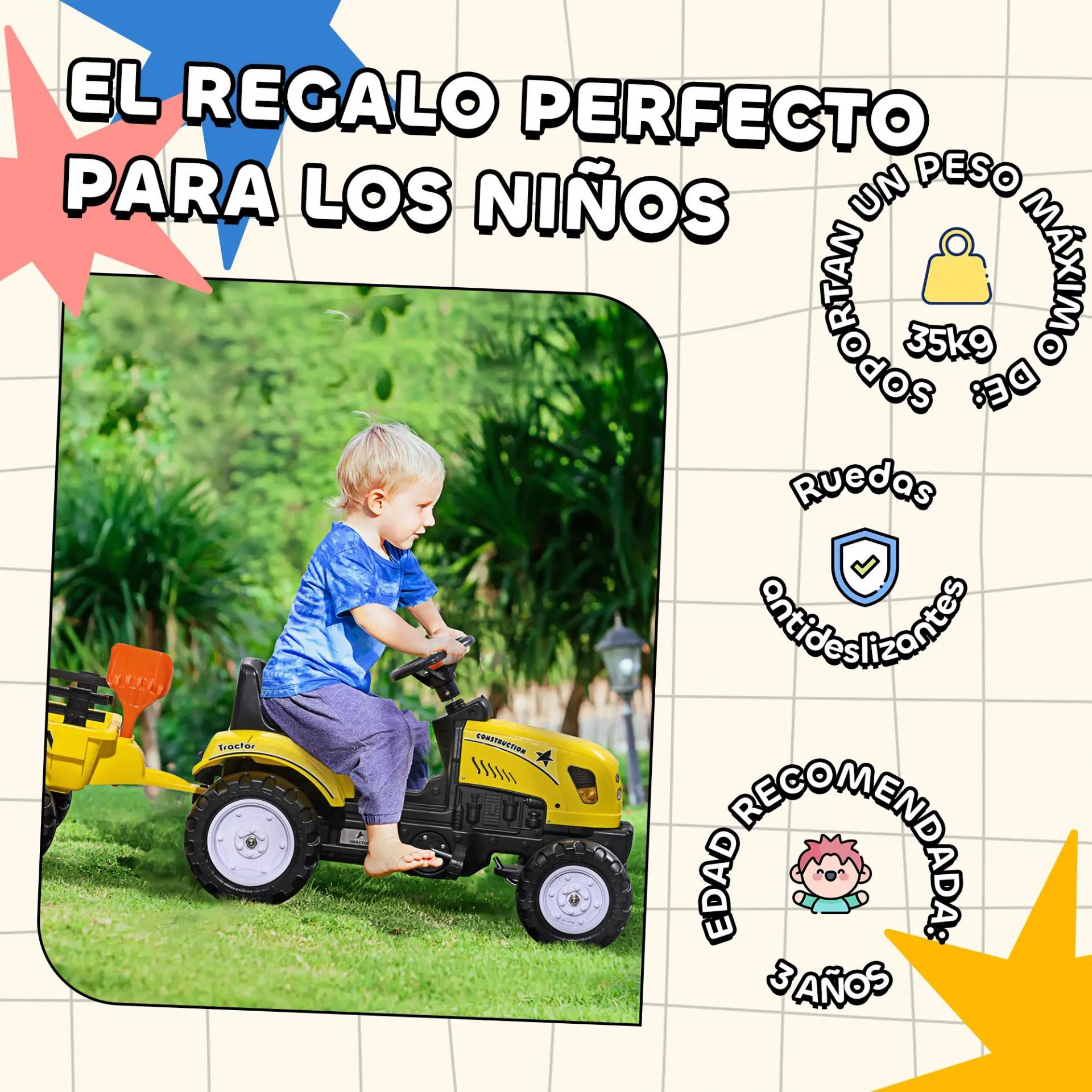 Tractor a Pedales para Niños a partir de 3 Años con Remolque y 2 Herramientas Carga 35 kg 133x42x51 cm Amarillo